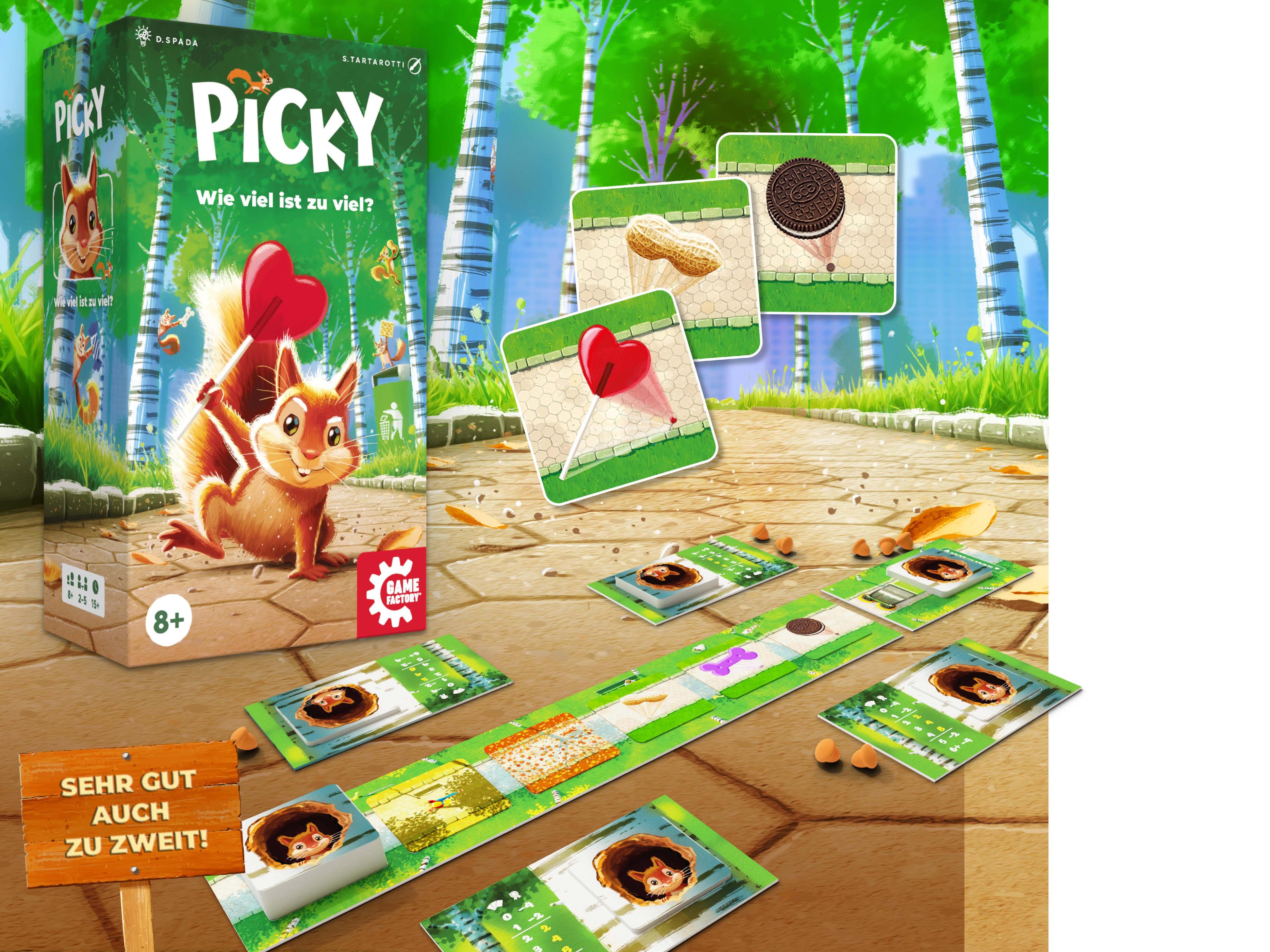 Eichhörnchen sind bekanntlich die geborenen Sammler. Einfach nur viele Vorräte zu horten führt in Picky aber nicht zum Sieg. Nur wählerische Eichhörnchen mit einem guten Gedächtnis werden hier mit Erfolg belohnt! Wer nämlich zu viel oder zu wenig einer Nahrungsart sammelt, dem vermasseln die Minuspunkte schnell die Tour. Wenn man sich doch bloß noch daran erinnern könnte, wie viele Bonbons, Erdnüsse, Hundesnacks, Kekse und Lollipops man schon versteckt hat …