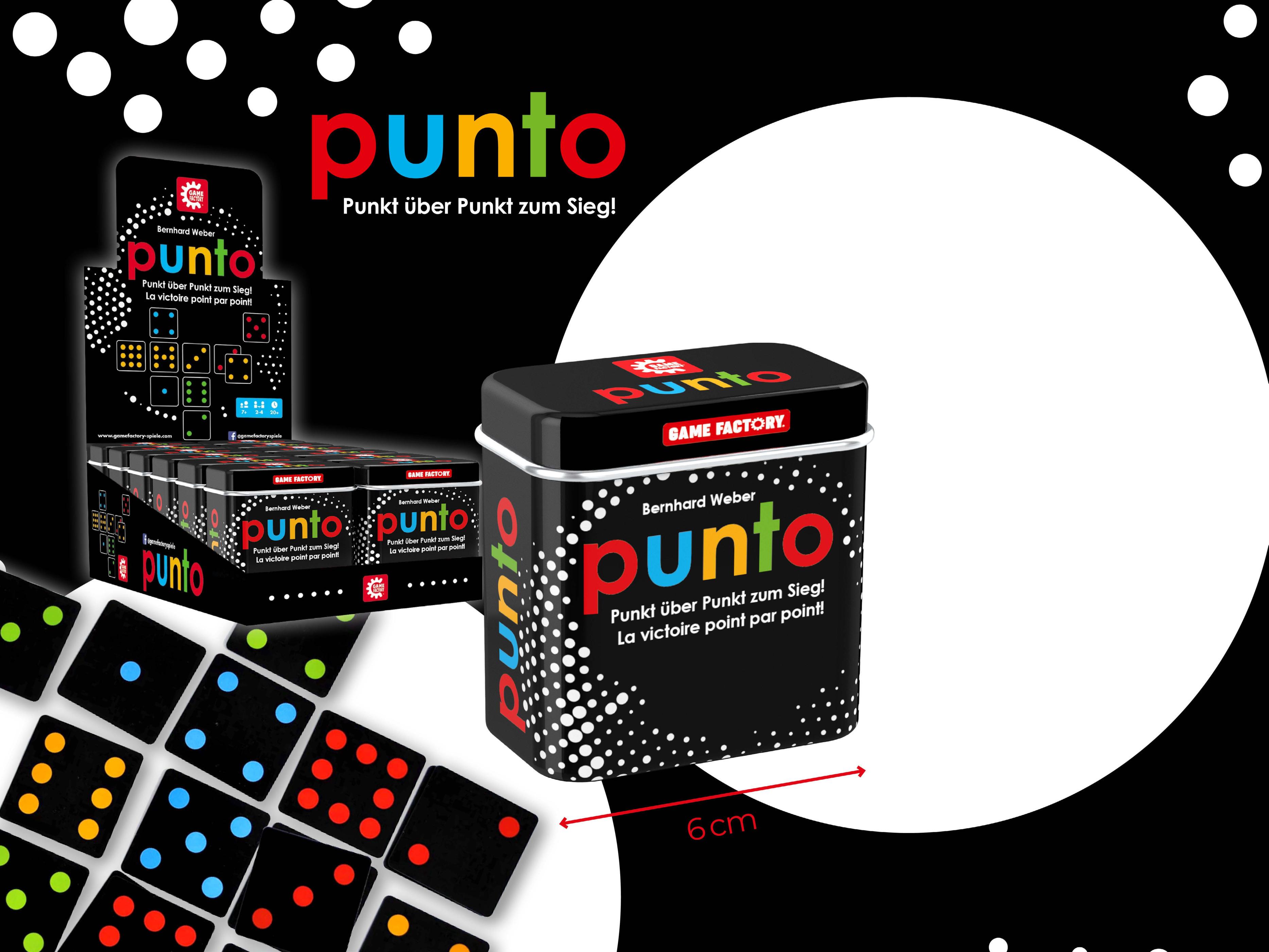 PUNTO bringt es auf den Punkt: minimale Regel, maximaler Spaß. Cleverness und Glück bringen dir den Sieg. Decke eine Karte deiner Farbe auf und lege diese an eine bestehende Karte an. Falls eine ausliegende Karte weniger Punkte zeigt, kannst du diese auch überdecken. Bringst du 4 eigene Karten in eine Reihe, gewinnst du die Runde!