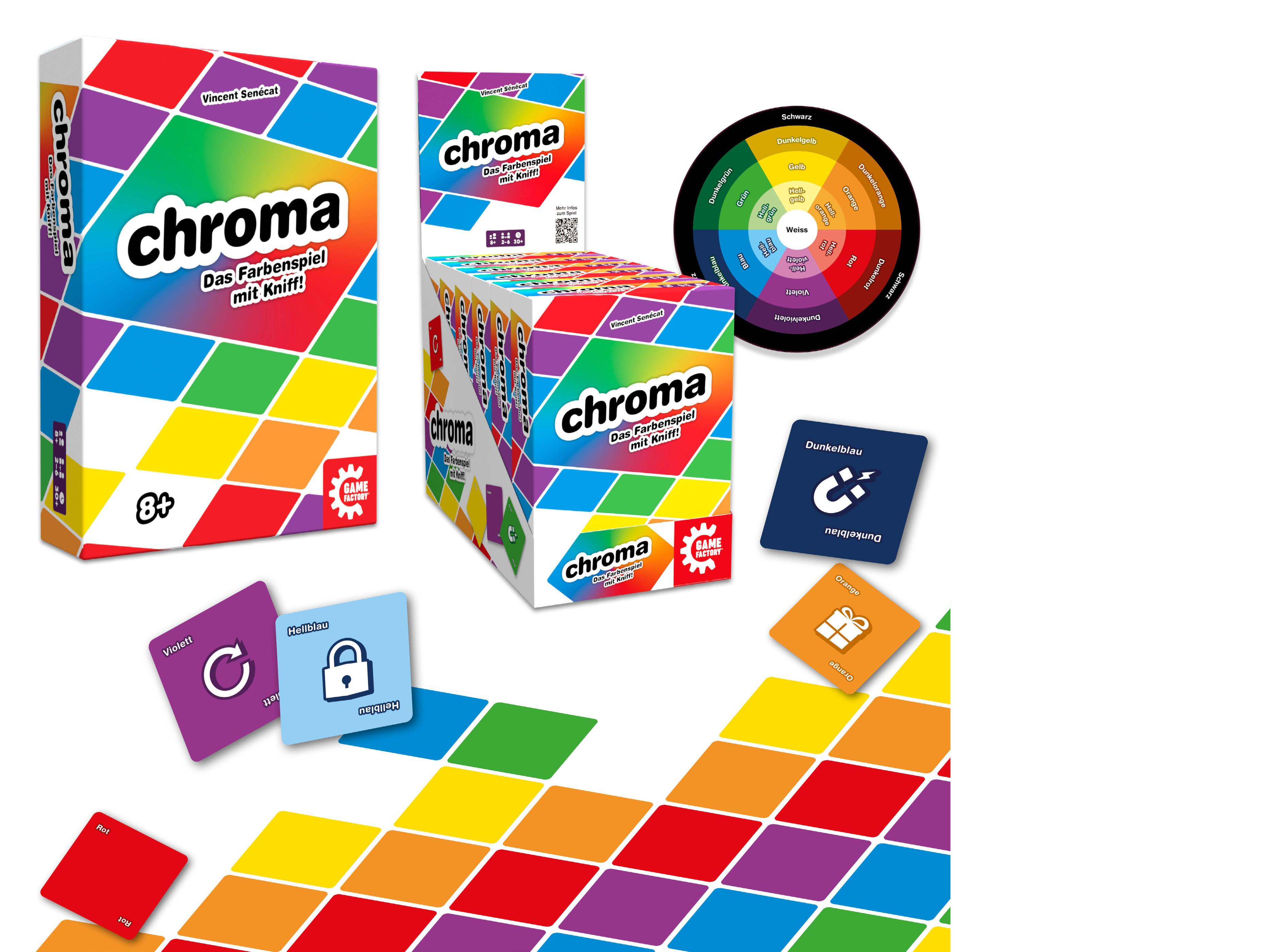 Chroma ist eine farbenfrohe Mischung aus Lege- und Ablegespiel, bei dem es gilt, als Erster alle Handkarten loszuwerden, indem man sie clever ins Farbraster auf dem Tisch legt. An je mehr Karten die abgelegte Karte dabei angrenzt, desto mehr Karten kann man auch loswerden –aber Achtung: Nur harmonische Farbverläufe sind erlaubt!