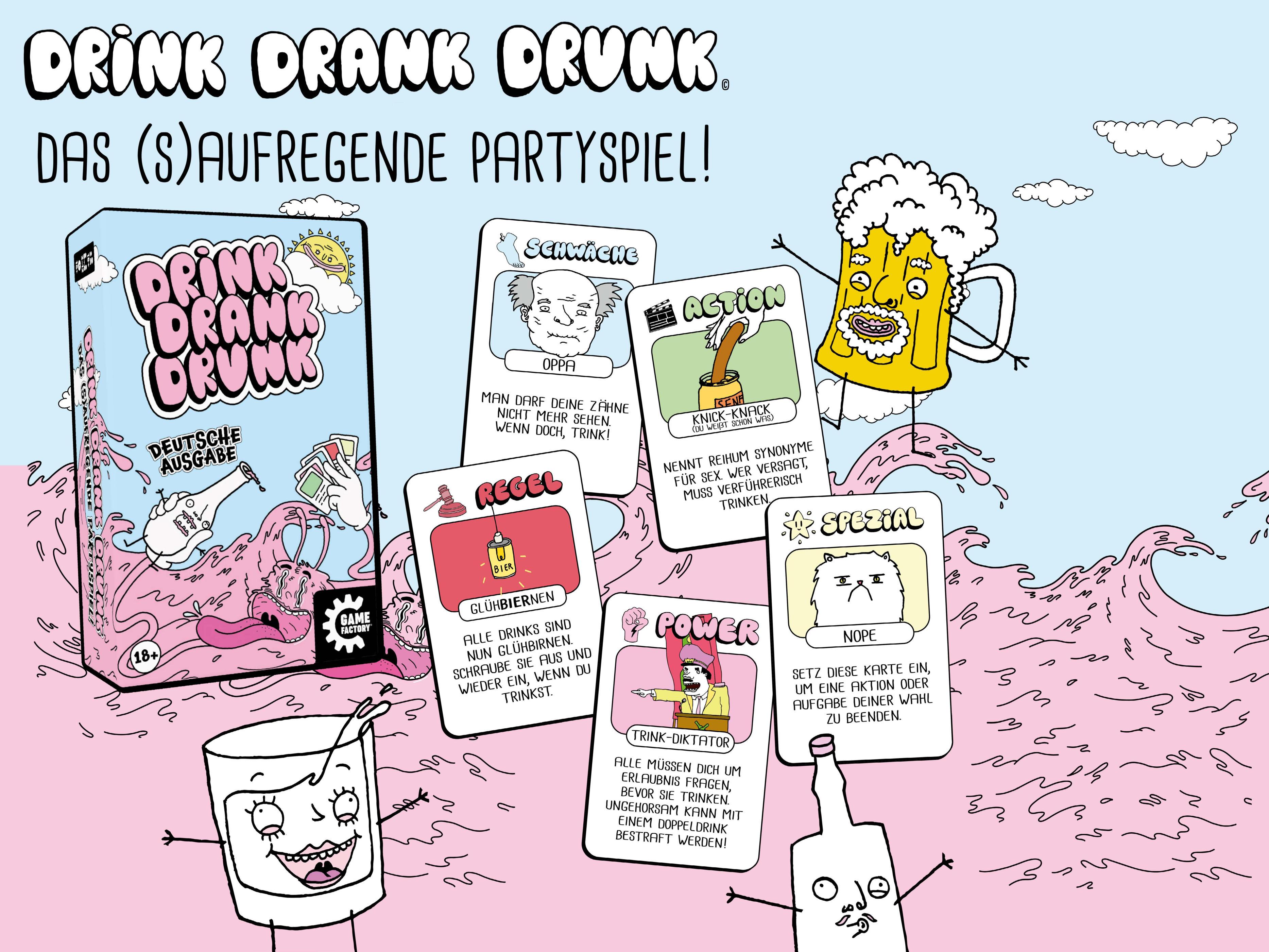 DRINK DRANK DRUNK ist ein Partyspiel für junge Erwachsene und ist vollgepackt mit Kreativität und Humor. 6 Kategorien, 200 Karten – jede davon anders und einzigartig illustriert – bringen jede Party zum Kochen. Immer andere Spielsituationen und verschiedenste Spielvarianten sorgen dafür, dass dieses Trinkspiel nie langweilig wird.