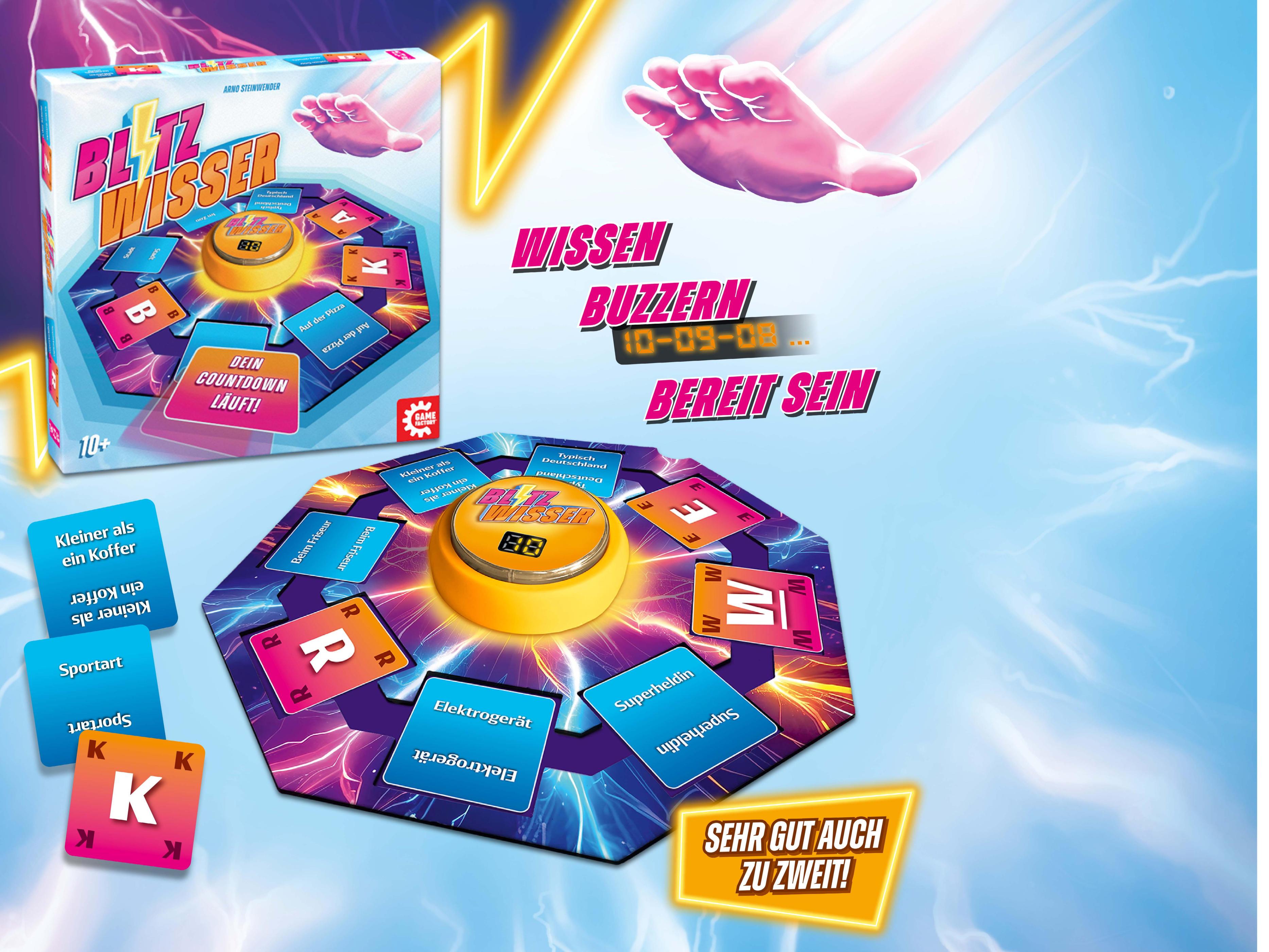 Du weißt viel … aber weißt du es auch schnell? Ein Elektrogerät mit L, ein Superheld mit B oder etwas Typisches für Deutschland mit K – denke schnell und setze deinen Nachbarn mit blitzartigem „Buzzern“ unter Druck! Verliere selbst aber nicht den Kopf, wenn dir ein Mitspieler die Kategorie vor der Nase wegschnappt und sei bereit, wenn es zum großen Showdown kommt.