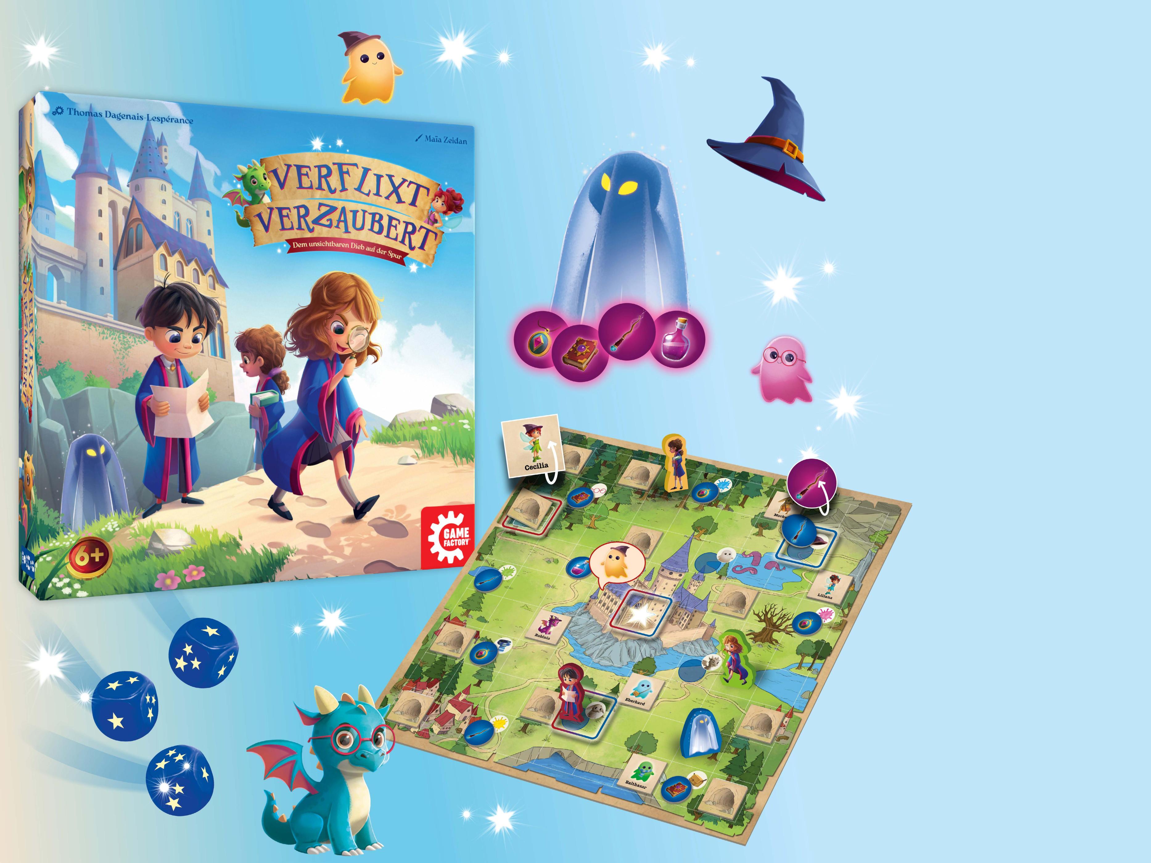 VERFLIXT VERZAUBERT ist ein zauberhaftes Detektivspiel, bei dem ein bis drei Spieler als Zauberschüler die Identität des Diebes ans Tageslicht bringen müssen, indem sie seine Spuren verfolgen und die anderen Verdächtigen ausschließen. Gleichzeitig schlüpft ein Spieler in die Rolle des Diebes und muss alle vier Zaubergegenstände nden und mit ihnen entkommen, bevor er erwischt wird.