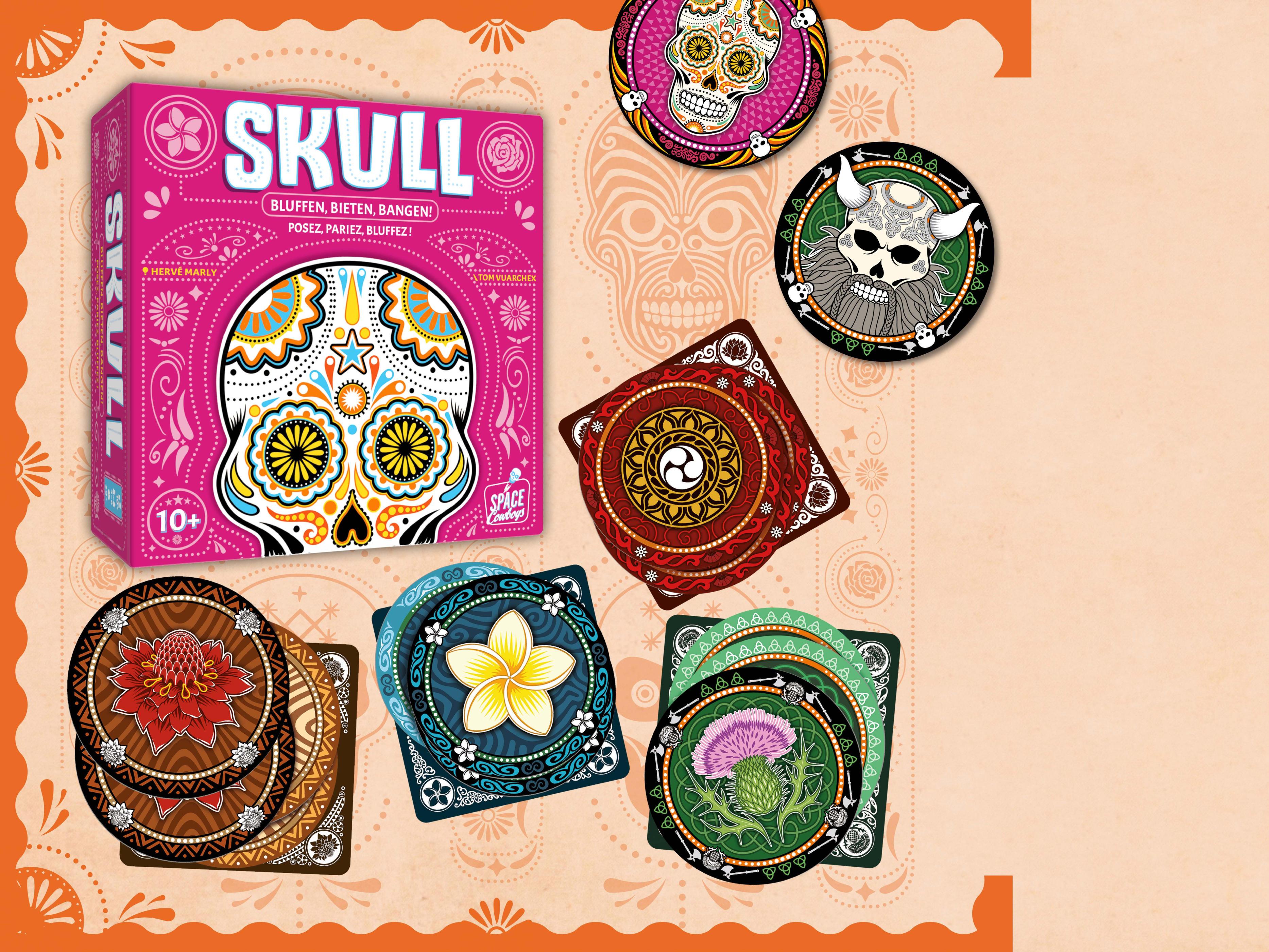 SKULL ist Bluffen in seiner reinsten Form und fängt das Spielgefühl des Pokers perfekt ein! Mit viel Spannung und Bangen gilt es, die Mitspieler zu verunsichern und den eigenen Mut und Scharfsinn zu beweisen. SKULL ist ein erbarmungsloser Bluff-Klassiker mit einfachen Regeln, der bereits mit dem französischen Spielepreis „As d‘Or 2011“ ausgezeichnet wurde!