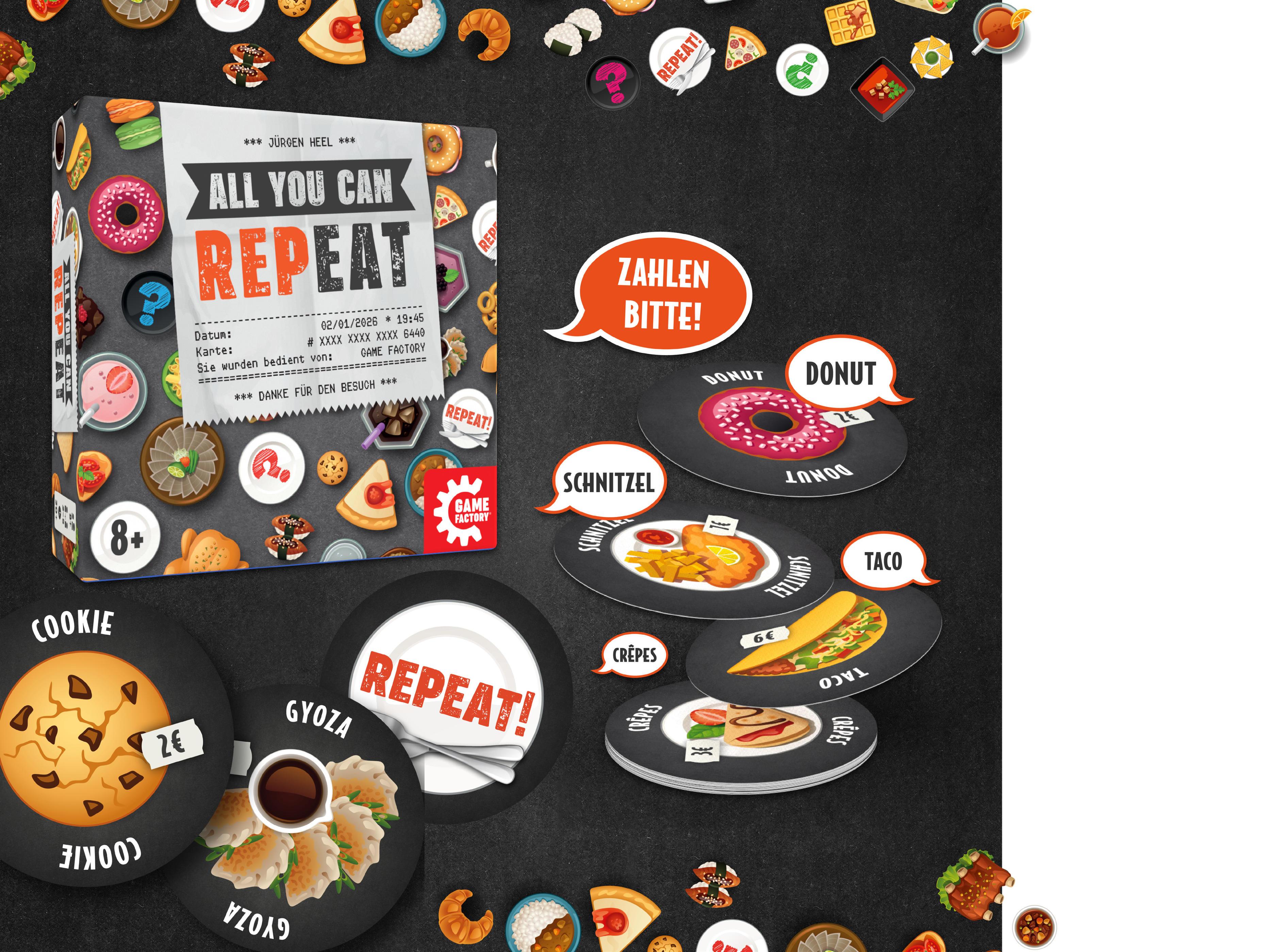 Wer kennt es nicht? Man lässt es sich in einem großartigen Restaurant so richtig gut gehen, doch dann kommt die Rechnung. Wer weiß denn da noch, was alles eure Gaumen erfreut hat? Einzig ein gutes Gedächtnis kann dich davor bewahren, dass dein Konto zu sehr belastet wird … also: Merk dir gut, was alles bestellt wird, erwisch den besten Zeitpunkt, um deinen Mitspielern mit einem „Zahlen bitte!“ die Suppe zu versalzen und sei allzeit bereit für die berüchtigte REPEATKarte!