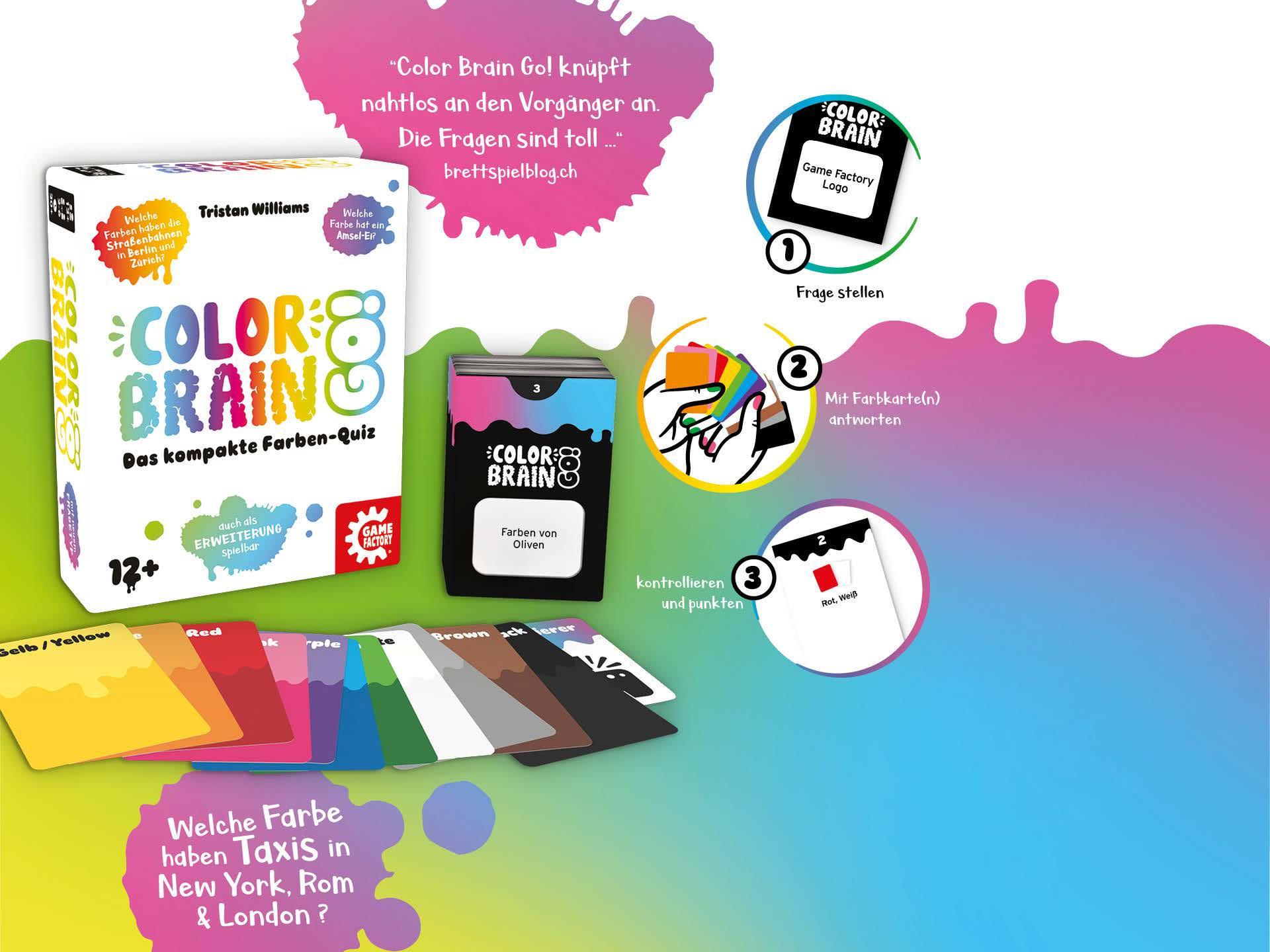 Das erfolgreiche Farbenquiz COLOR BRAIN war 2020 auf der Spiel des Jahres Empfehlungsliste. Jetzt gehts in die 2. Runde. COLOR BRAIN GO! liefert 200 Fragen quer durch die Farbpalette. Es ist eigenständig spielbar und auch als Erweiterung zum Grundspiel.