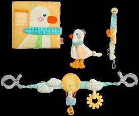 Contents: 1 pram decoration, 1 pacifier chain, 1 grasping toy, 1 photo album. Material: polyester, plastic. Photo album dimensions 20 x 20 cm. 4010168285030