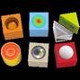Material Display: Pappe. Material nhalt: Boomerang (Hartschaum) EVA und Frisbee SBS.