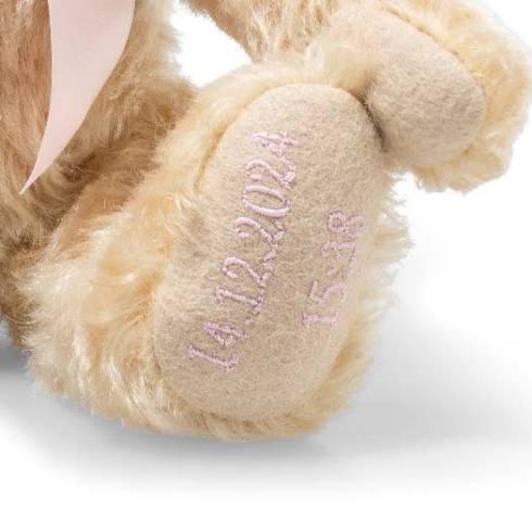 Der personalisierte Teddybär ist das ideale Geschenk für jeden Anlass, wie Geburtstage, Jubiläen oder Namensfeiern. Schleife in Rosa, Blau oder Gold sowie Bestickung der Fußsohlen in den gleichen Farben wählbar. Die Lieferung efolgt in 10 Arbeitstagen. Maximal sind 2 Zeilen mit je 10 Zeichen, keine Symbole möglich. Nur in den Sprachen deutsch, englisch und französisch verfügbar.