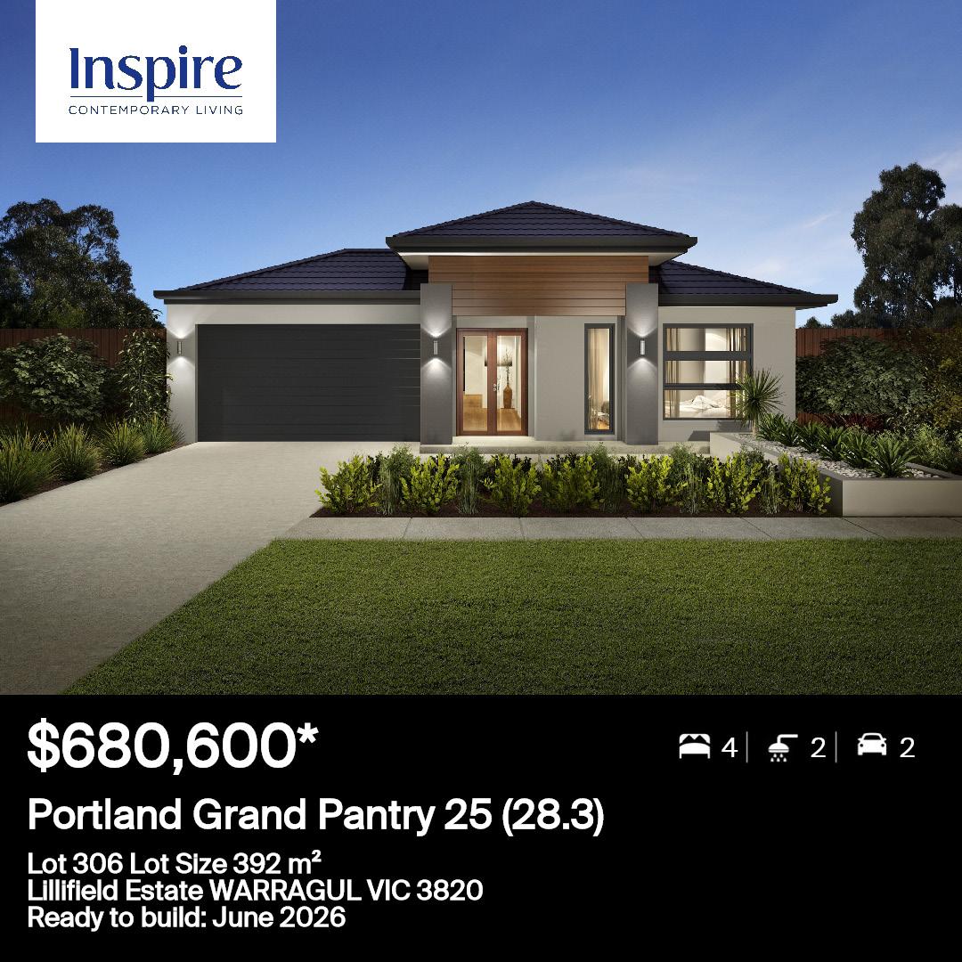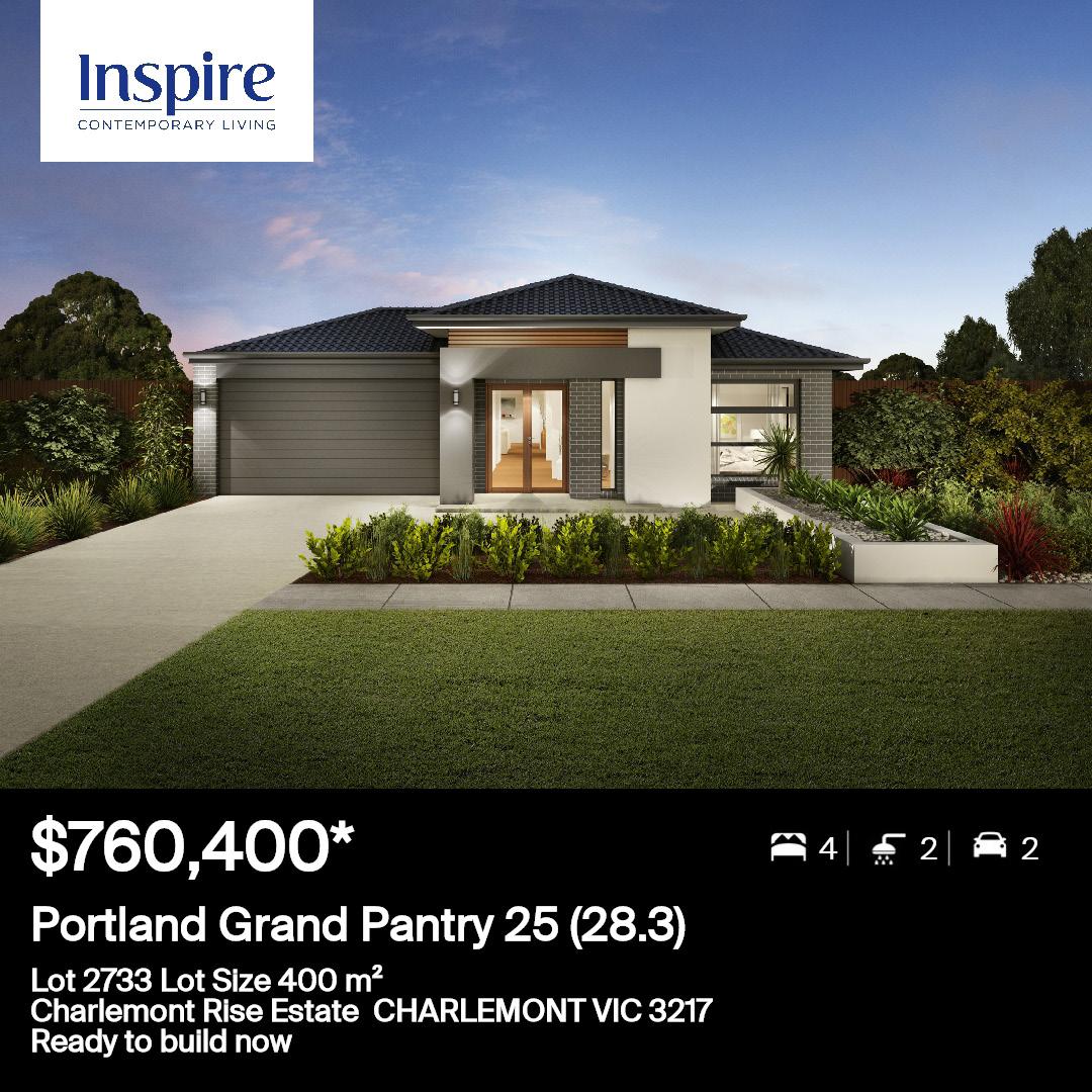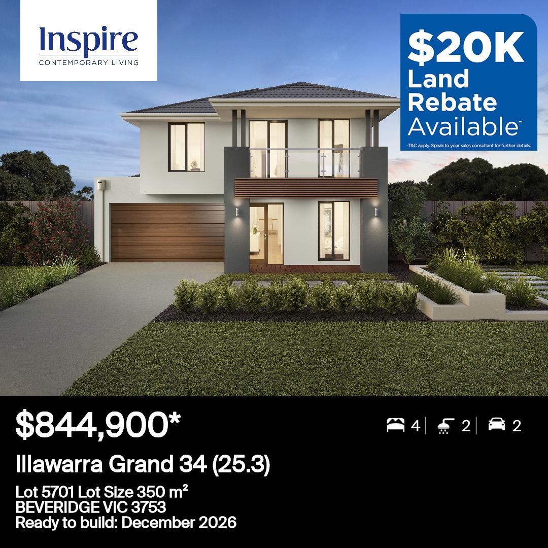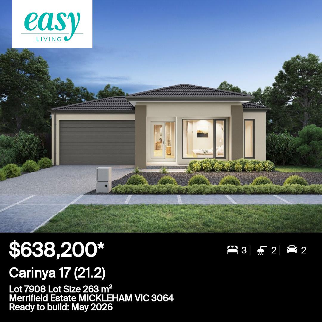 *Price based on Developer supplied engineering plans and Plan of Subdivision; standard floor plan with preferred siting (without alterations), Carlisle’s recommended Building Surveyor and residential zoning at package date. Confirm land prices and availability prior to purchase. Subject to developer and council approval. Pricing also excludes features not supplied by Carlisle, including fencing, landscaping, planting, letterbox, decking and driveway.