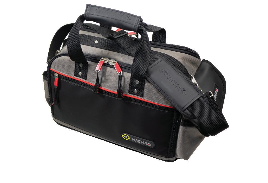 50 poches et support d’outils, ainsi que des panneaux dépliants pour un accès facile aux outils. Base en 100 % caoutchouc, étanche et résistante aux déchirures. Poignée et bretelle rembourrées veillent au confort maximum. Compartiment central rembourré à accueillir un ordinateur portable. Poche à document à l’interne.