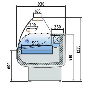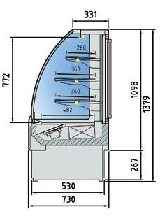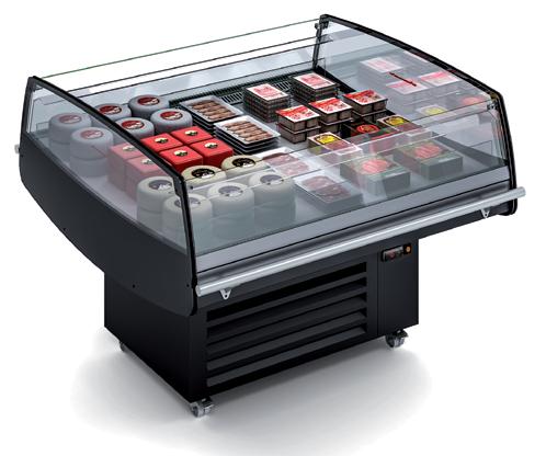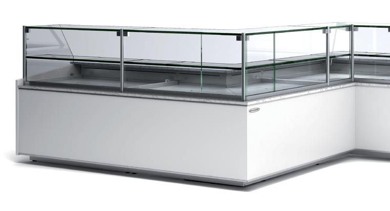 Vetrine con refrigerazione ventilata canalizzabili estremamente versatili disponibili con vetri curvi al fine di potersi adattare a qualsiasi tipo di spazio o arredamento. Il cristallo frontale, quello superiore e i laterali sono realizzati con sistema vetro camera al fine di mantenere sempre una visibilità perfetta del prodotto esposto evitando qualsiasi tipo di forma di condensazione. Struttura interna realizzata in Acciaio Inox AISI 304. Ripiani regolabili in altezza con illuminazione a led su ogni singolo ripiano. Rifiniture con profili in alluminio anodizzato. Termostato digitale regolabile Carel. Sbrinamento automatico. Evaporazione automatica della condensa. Isolamento in poliuretano espanso con densità 40 Kg/m cubo. Spalle in ABS termoformate e coibentate (spessore 40 mm). Temperatura +2°/+8°C. Classe climatica 4M1. Decorazione totale in tutti i colori RAL inclusa. Colore nero di serie. Alimentazione 230V. MARCHIO CE