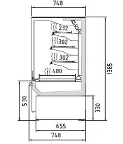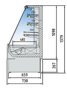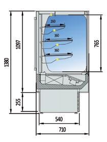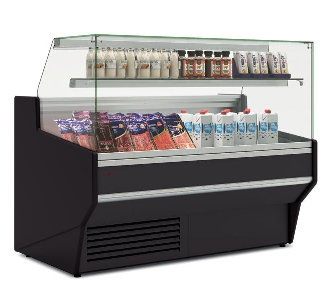 Murali con refrigerazione ventilata progettati con frontale aperto per concetto “auto servizio” adattabili a qualsiasi tipo di spazio o arredamento. Struttura interna realizzata in Acciaio Inox AISI 304. Ripiani regolabili in altezza con illuminazione a led su ogni singolo ripiano.Tendina notte auto avvolgente manuale con freno. Rifiniture con profili in alluminio anodizzato.Termostato digitale regolabile. Sbrinamento automatico. Evaporazione automatica della condensa. Isolamento in poliuretano espanso con densità 40 Kg/m cubo. Spalle in ABS termoformate e coibentate (spessore 40 mm).Temperatura +2°/+8°C. Classe climatica 4M1. Decorazione totale in tutti i colori RAL inclusa. Colore nero di serie. Alimentazione 230V. MARCHIO CE