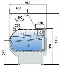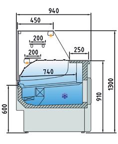 Vetrine refrigerate statiche, non canalizzabili, profondità 940 mm. Struttura esterna realizzata in lamiera di acciaio preverniciata. Vetro frontale temperato ribaltabile (apertura dall’alto). Sbrinamento automatico. Evaporazione automatica della condensa. Piano di esposizione disponibile in 2 versioni, uno in AISI 304 optional e l’altro in lamiera di acciaio con speciale trattamento con resine epossidiche atossiche anti corrosione, idoneo per alimenti. Piano di lavoro operatore in Acciaio Inox AISI 304. Spazio espositivo utile di 640 mm di profondità. Illuminazione a led di serie posizionata sotto il piano superiore. Riserva refrigerata con porte con apertura utile mm 440X270. Controllo elettronico di temperatura Carel. Isolamento in poliuretano espanso con densità 40 Kg/m cubo. Spalle in ABS termoformate e coibentate (spessore 40 mm). Parte superiore in laminato melaminico. Rifiniture con profili in alluminio. Temperatura -1°/+5°C. Classe climatica 4M1. Indicatore di temperatura analogico posizionato all’interno della vetrina. Fascia frontale disponibile in 8 differenti colori senza sovrapprezzo, colore nero di serie. Ripiano intermedio di cristallo e scorrevoli in plexiglas (optional). Alimentazione 230V. MARCHIO CE