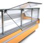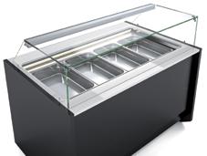 Vetrine con sistema di riscaldamento a secco canalizzabili estremamente versatili disponibili sia in versione con vetri curvi che squadrati al fine di potersi adattare a qualsiasi tipo di spazio o arredamento. Il cristallo frontale, quello superiore e i laterali sono realizzati con sistema vetro camera. Apertura posteriore tramite porte scorrevoli posteriori. Struttura interna e ripiani realizzati in Acciaio Inox AISI 304 regolabili in altezza con illuminazione a led su ogni singolo ripiano. Rifiniture con profili in alluminio anodizzato. Cassetto umidificatore. Isolamento in poliuretano espanso con densità 40 Kg/m cubo. Spalle in ABS termoformate e coibentate (spessore 40 mm). Temperatura regolabile +60°/+70°C. Decorazione totale in tutti i colori RAL inclusa. Colore nero di serie. Alimentazione 230V. MARCHIO CE