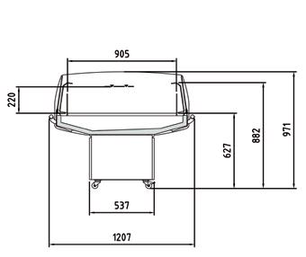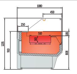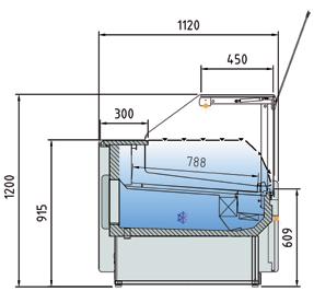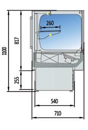 Vetrine refrigerate ventilate canalizzabili profondità 1100 mm. Struttura esterna realizzata in lamiera di acciaio preverniciato. Vetro frontale temperato squadrato e ribaltabile (apertura dall’alto). Sbrinamento automatico. Evaporazione automatica della condensa. Piano di lavoro operatore e piano di esposizione realizzati in Acciaio Inox AISI 304. Spazio espositivo utile di 876 mm di profondità. Fornita di serie con sistema di Illuminazione a led posizionati sotto il piano superiore. Riserva refrigerata con porte con apertura utile mm 440X270. Controllo elettronico di temperatura Carel. Isolamento in poliuretano espanso con densità 40 Kg/m cubo. Spalle in ABS termoformate e coibentate (spessore 40 mm). Rifiniture con profili in alluminio anodizzato. Temperatura -1°/+5°C. Classe climatica 4M1. Decorazione totale in nero, bianco o grigio di serie, optional tutti i colori RAL. Alimentazione 230V. MARCHIO CE