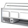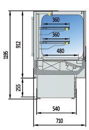 Espositori con refrigerazione ventilata. Piano espositivo interno in Acciaio Inox AISI 304. Vetri temperati frontali con laterali in vetro camera. Sbrinamento automatico. Evaporazione automatica della condensa. Spazio espositivo utile di 905 mm di profondità. Controllo elettronico di temperatura. Paracolpi frontali. Temperatura -1°/+5°C. Classe climatica 4M1. Colore nero di serie. Alimentazione 230V. MARCHIO CE