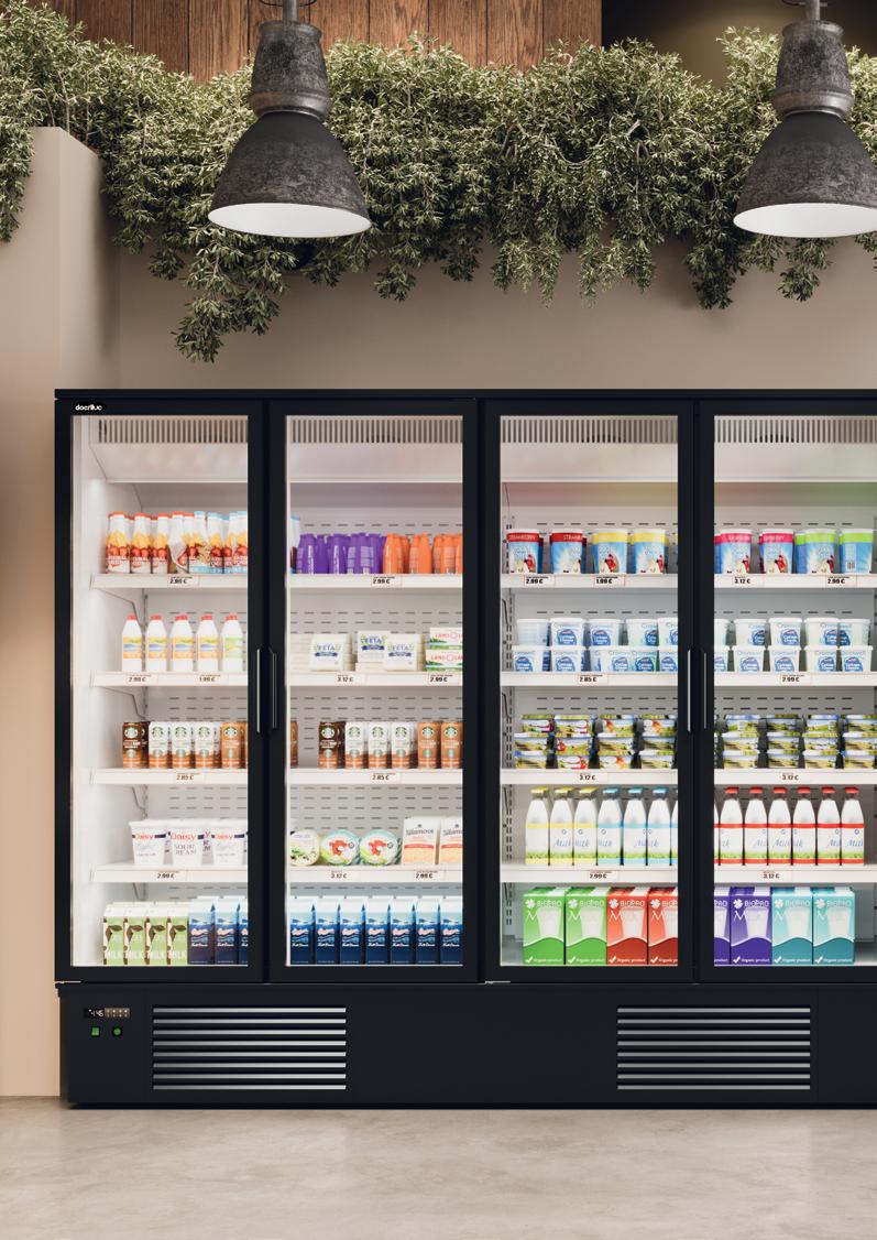Espositori con refrigerazione ventilata con porte a vetro, utilizzabili in base ai modelli sia a temperatura positiva che negativa. Modelli a 2, 3, 4 porte. Struttura esterna realizzata in lamiera di acciaio preverniciato e parte interna in lamiera di acciaio con speciale trattamento con resine epossidiche atossiche anticorrosione (idonee per alimenti). Ripiani in lamiera verniciata atossica (idonea per alimenti), regolabili in altezza e dotati di porta prezzo. Illuminazione superiore a tubo led. Isolamento di 70 mm di spessore in poliuretano espanso con densità 40 Kg/m cubo. Termostato elettronico Carel. Temperatura TN -1°/+5°C. Classe climatica 4M1. Sbrinamento automatico. Evaporazione automatica della condensa. Struttura esterna in colore bianco o nero. A richiesta con sovrapprezzo interno in colore nero. Alimentazione 230V. MARCHIO CE.