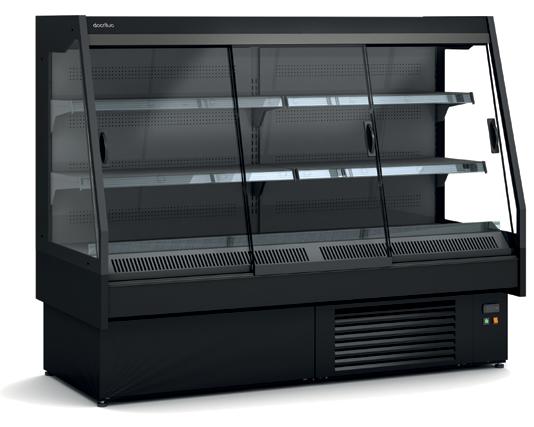 Espositori con refrigerazione ventilata. Piano espositivo interno in Acciaio Inox AISI 304. Vetri temperati frontali con laterali in vetro camera. Sbrinamento automatico. Evaporazione automatica della condensa. Spazio espositivo utile di 802 mm di profondità. Controllo elettronico di temperatura. Paracolpi frontali di serie. Temperatura -1°/+7°C. Classe climatica 4M1. Colore nero di serie.