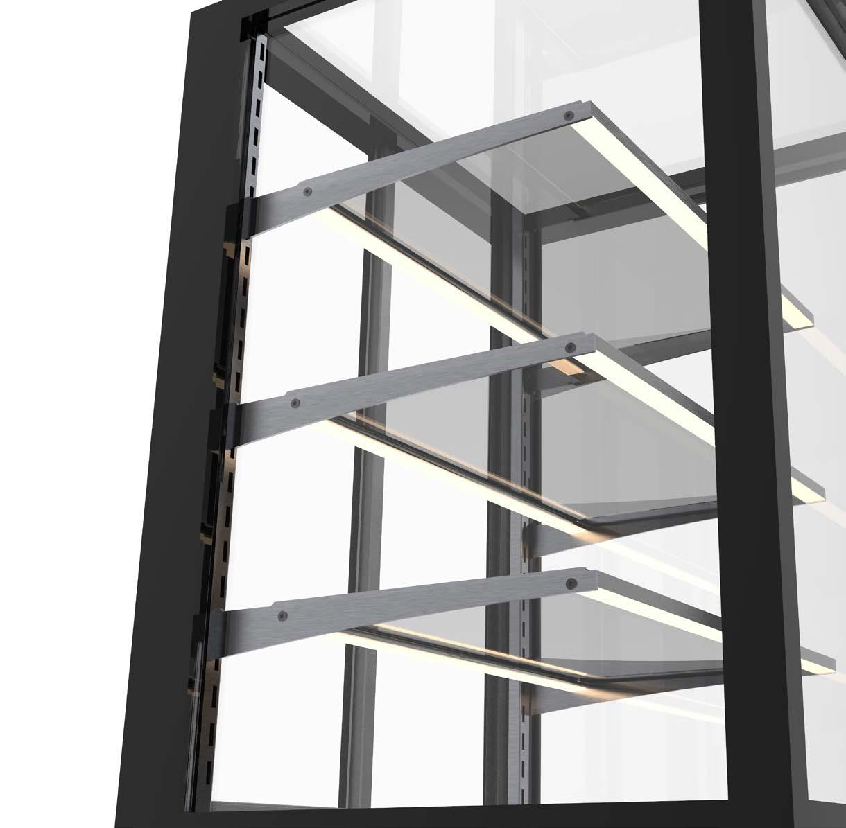 Struttura esterna realizzata completamente in cristallo senza nessun elemento di fissaggio esterno per non interferire con la visibilità del prodotto e per facilitare le operazioni di pulizia.