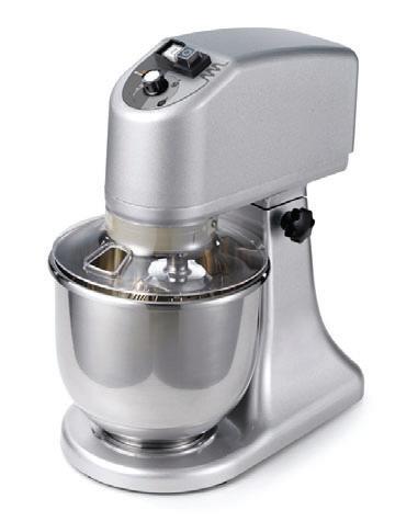 Impastatrice planetaria interamente in metallo verniciato (colore acciaio) corredata di vasca inox con manici da lt 6,7 e 3 utensili in Acciaio Inox (frusta a filo fino rinforzata, foglia, gancio impastatore), , griglia in Acciaio Inox AISI 304, ingranaggi in metallo a bagno d’olio, variatore elettronico di velocità, microinterruttore su alzata del braccio, 3 prese di moto per accessori. Motore 1700W. Alimentazione 230V. Doppio pulsante di sicurezza marcia/arresto con fungo di emergenza. MARCHIO CE