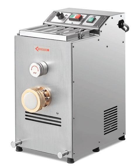 Macchine professionali per la produzione ad estrusione, con trafile in bronzo, di pasta fresca. Struttura in Acciaio Inox AISI 304. Vasca, coclea e mescolatore in Acciaio Inox AISI 304, estrusore in bronzo alimentare. Trasmissione a cinghia con riduttore esente da manutenzione per la coclea, a catena per il mescolatore. Organi di movimento con possibilità di ruotare avanti ed indietro. Possibilità di produrre diversi formati di pasta per mezzo del solo cambio della trafila in bronzo. In dotazione: cavo di alimentazione del tipo antifiamma, caraffa per misurazione dei liquidi, chiave per ghiera, crivello raccogli pasta solo per mod. MAPA75. MARCHIO CE