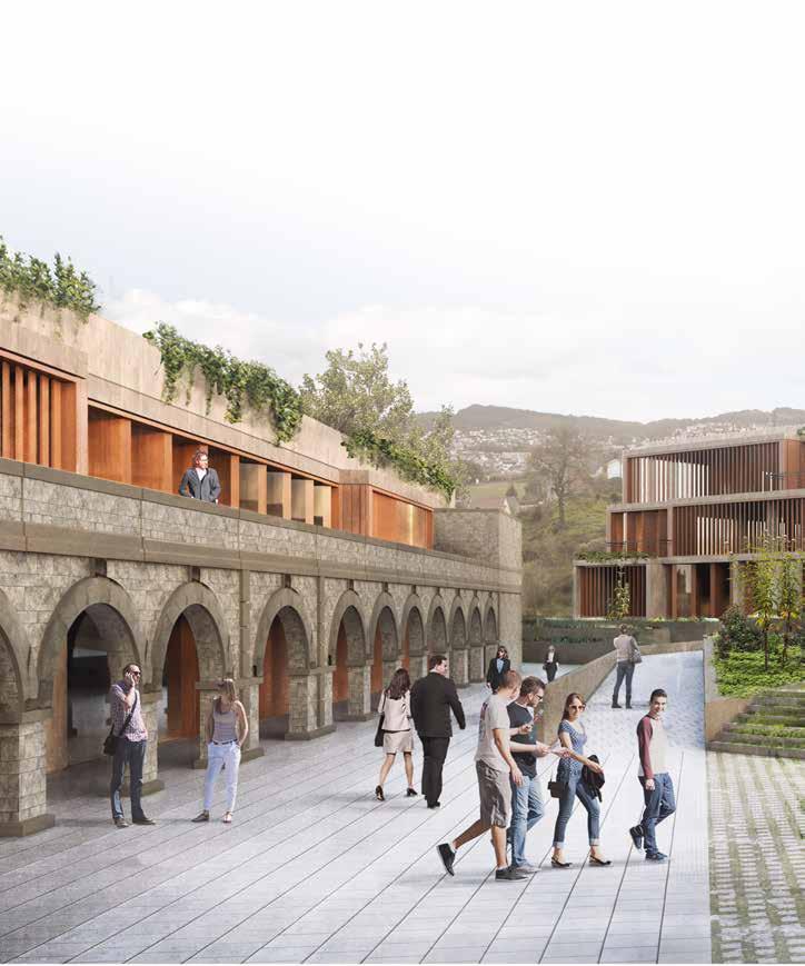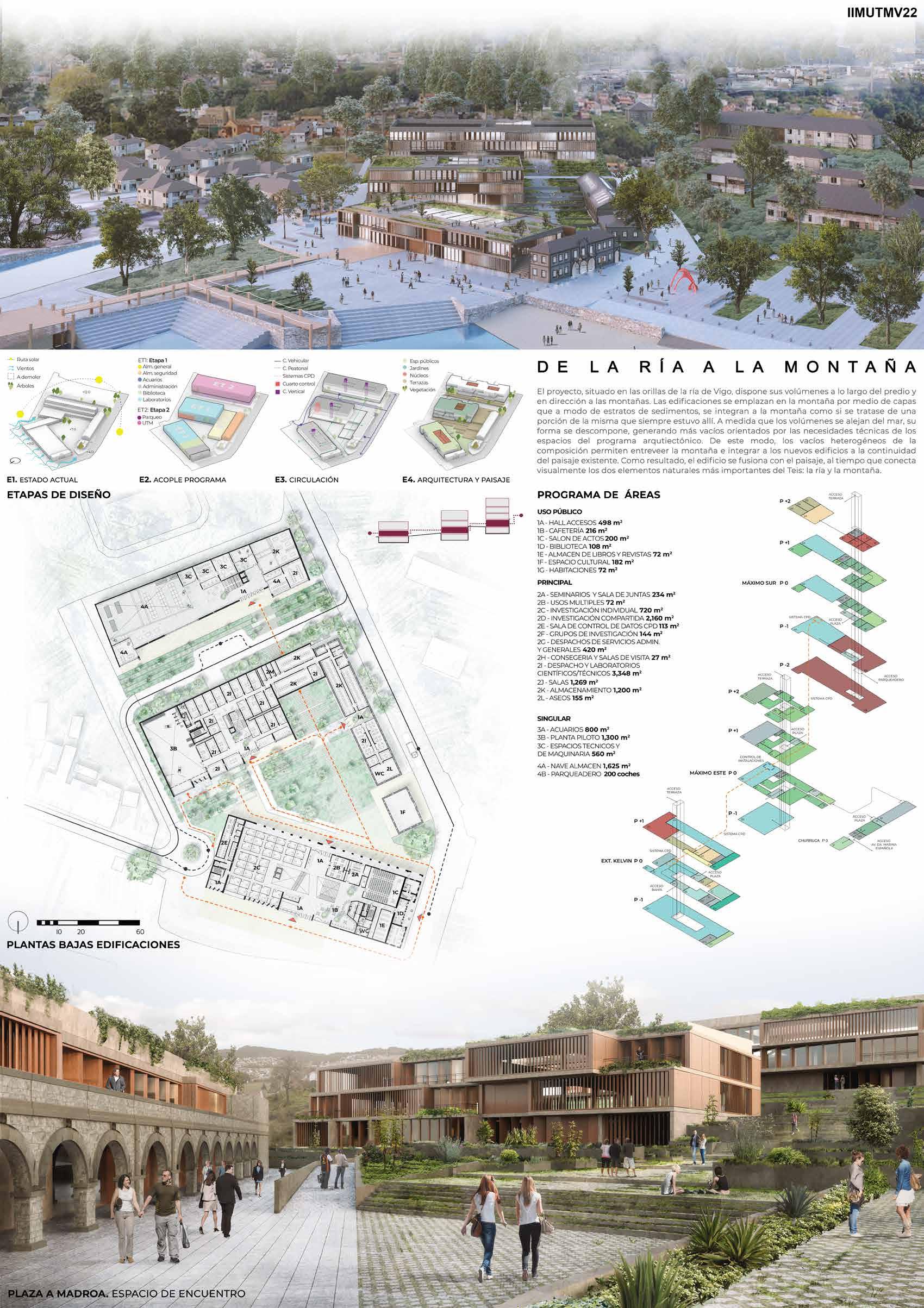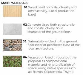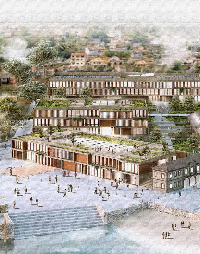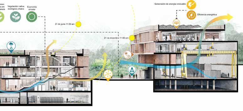 nZEB building. *The use of biomoase in the Galician forest, the use of geothermal energy through the use of wells in the Estuary and photovoltaic capture, is reduced to 96% of energy, achieving an energy rating building A. ENERGY 100 50 25 75 00 -50% ACTIVE SYSTEMS Energy Collection with Solar Panels Free-Cooling High Efficienty Production Machines Fans Ventilation Motion Detectors Lights in Common Spaces ENERGY 100 50 25 75 00 -75% Industrial Structure Recycled Materials Waste Reduction Materials Optimization Rain Water Reuse Permeable Pavements CONTEXT-BASED DESIGN I.S. -dB O.M. Interaction Spaces Universal Accesibility Acoustic Isolated Spaces SOCIAL WELFARE WATER -75% 00 25 50 75 100 WASTE -75% 00 25 50 75 100 MATERIALS -45% 00 25 50 75 100 *The parameters of a WELL certification are chosen. In order to guarantee the best benefits for employees, customers and the institution. Renewable Energy Generation Energy Efficiency Natural Solutions Native Vegetation 21 -Jun - 11am 21 - Dic - 11am Circular Economy