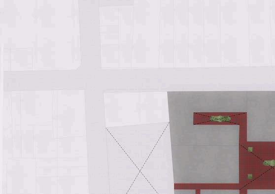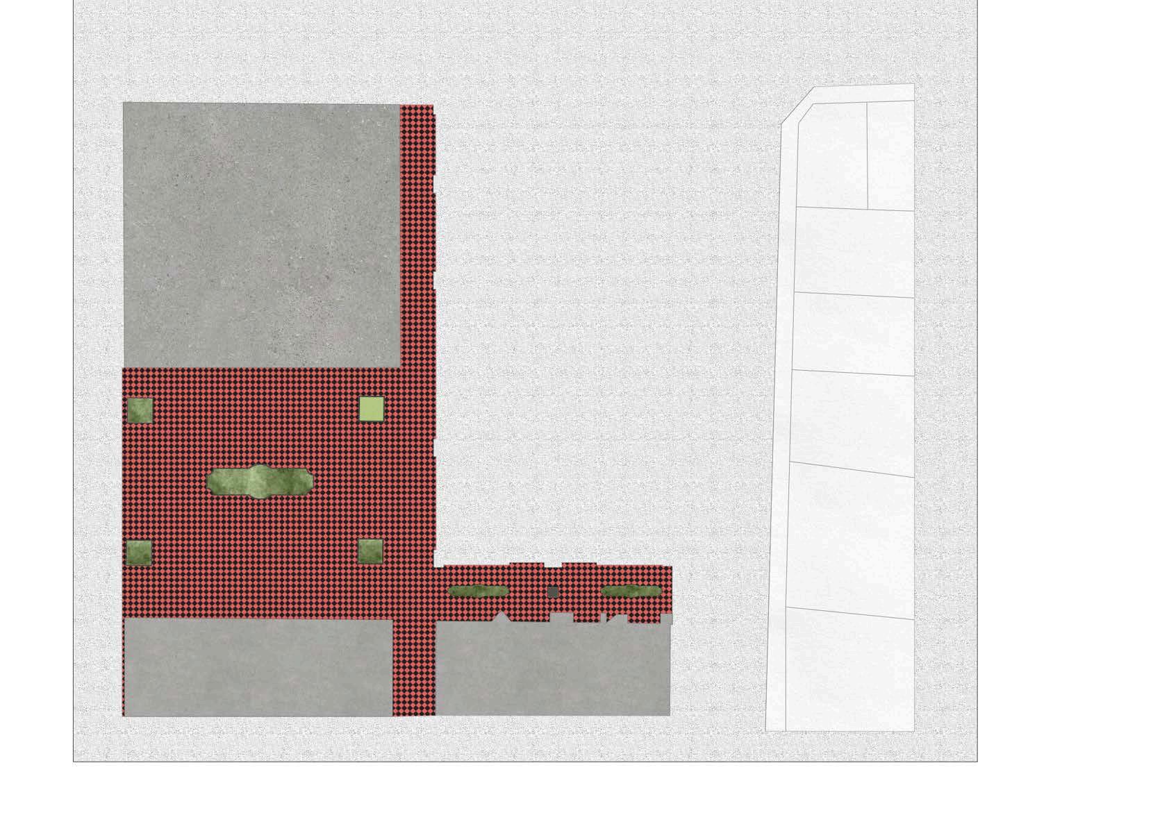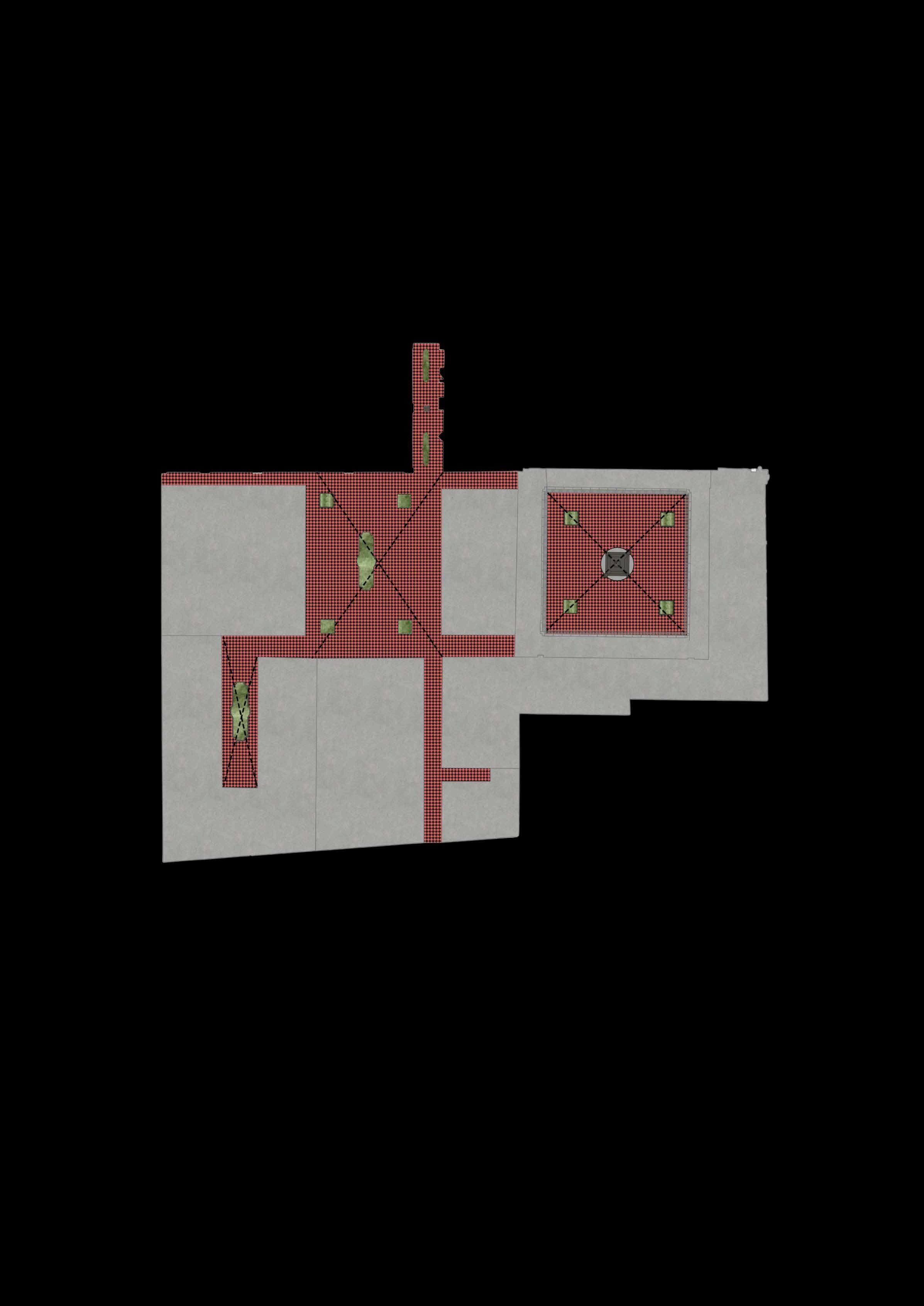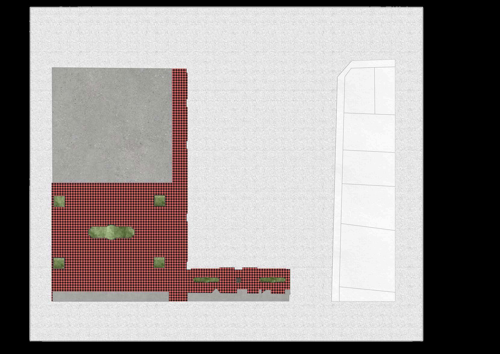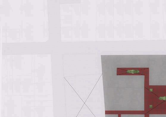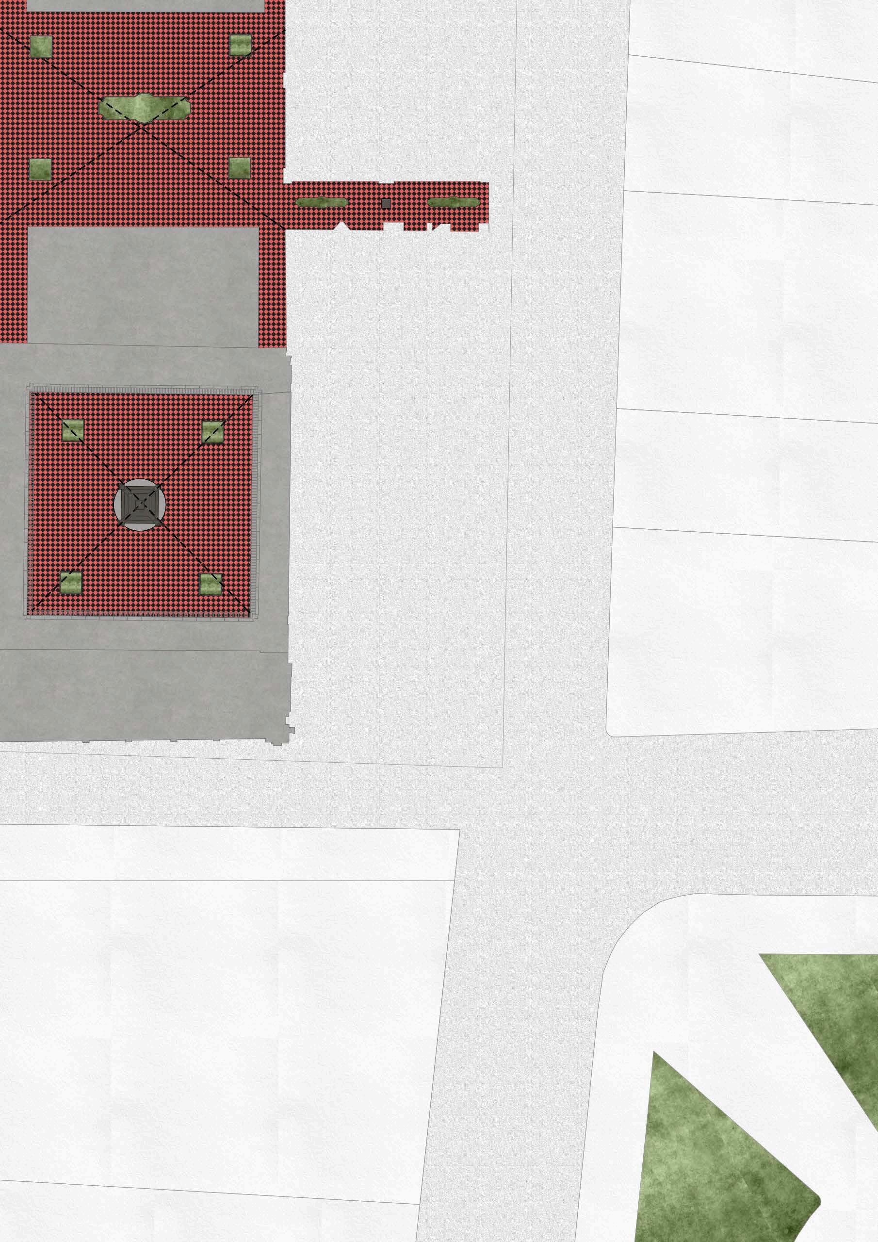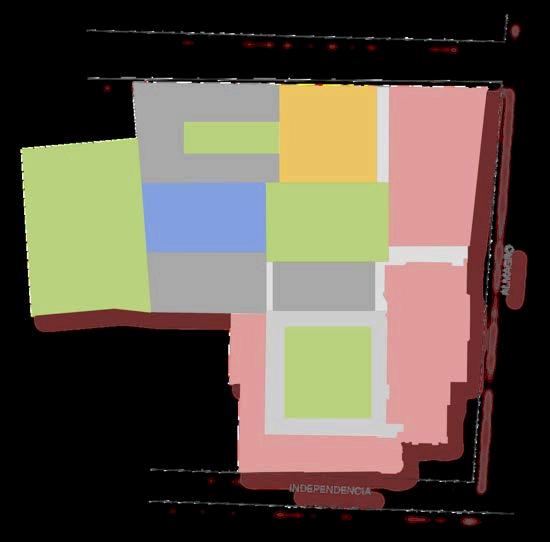 La estrategia complementaria se basa en la reinterpretación del patio inicial preexistente, adoptando su configuración como generador formal y funcionalparaelnuevopatiocentraldel proyecto. Este gesto permite organizar los bloques alrededor de un vacío articulador que actúa como punto de encuentro y distribuidor hacia las distintassubzonas.Almantenerlaforma y proporción del área verde central, se preservaelespíritudelantiguopatioque ocupaba esa ubicación, integrando la memoria del lugar dentro de la propuesta contemporánea. El nuevo patio central, junto con el patio subsidiario, establece un sistema de espacios abiertos que ordena el flujo interno, aporta claridad espacial y refuerzalarelaciónentrelosvolúmenes nuevos y los elementos conservados. Así,laestrategiadepatiosseconvierte enunrecursoclaveparaestructurarel conjunto,mejorarlacalidadambientaly consolidar una identidad común entre lasáreasdelproyecto.