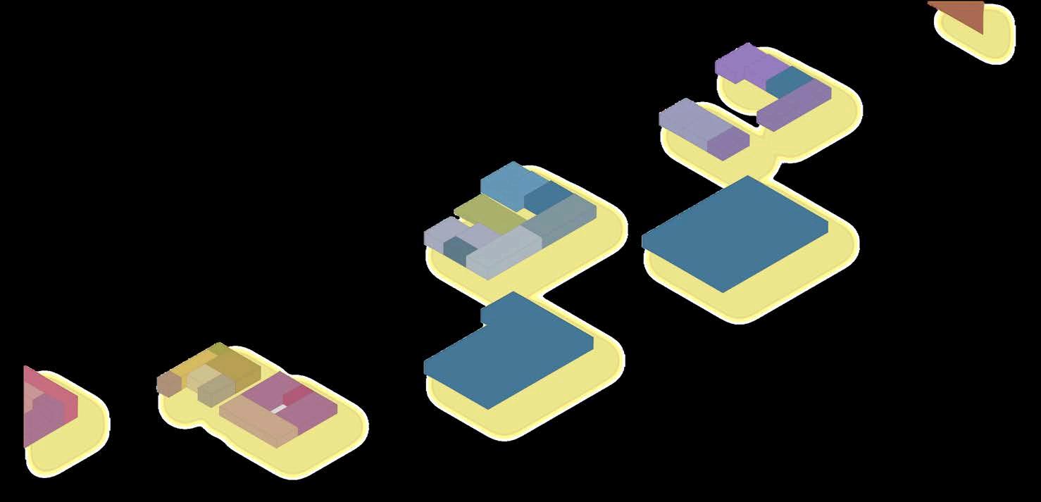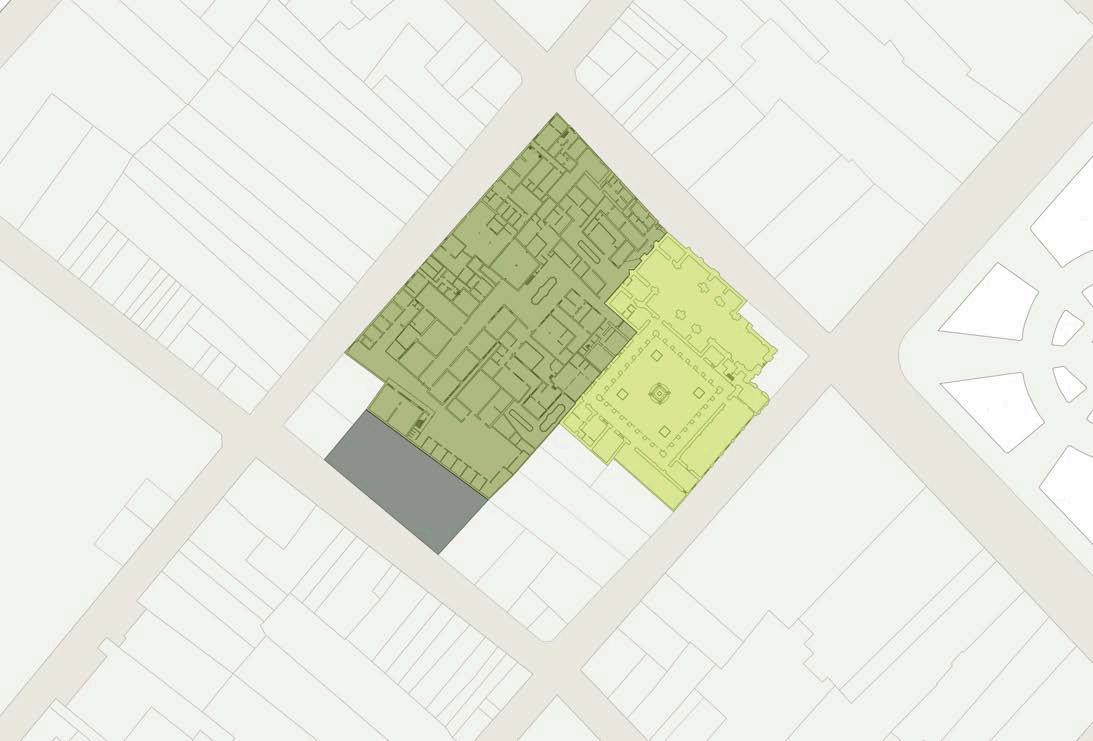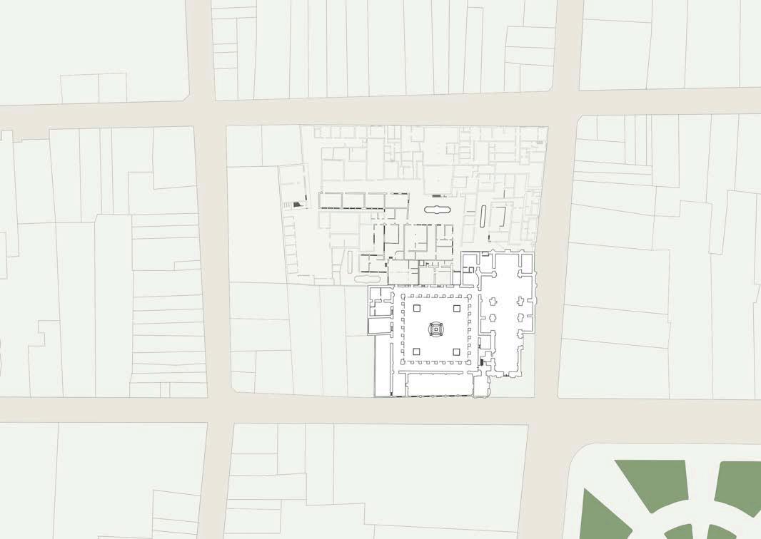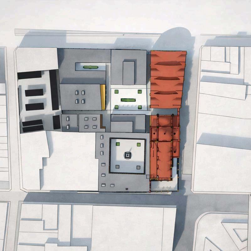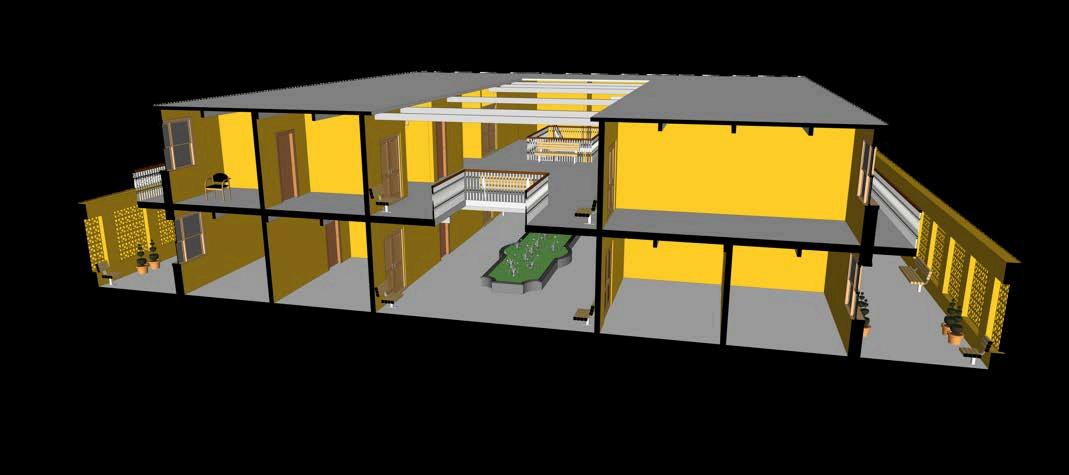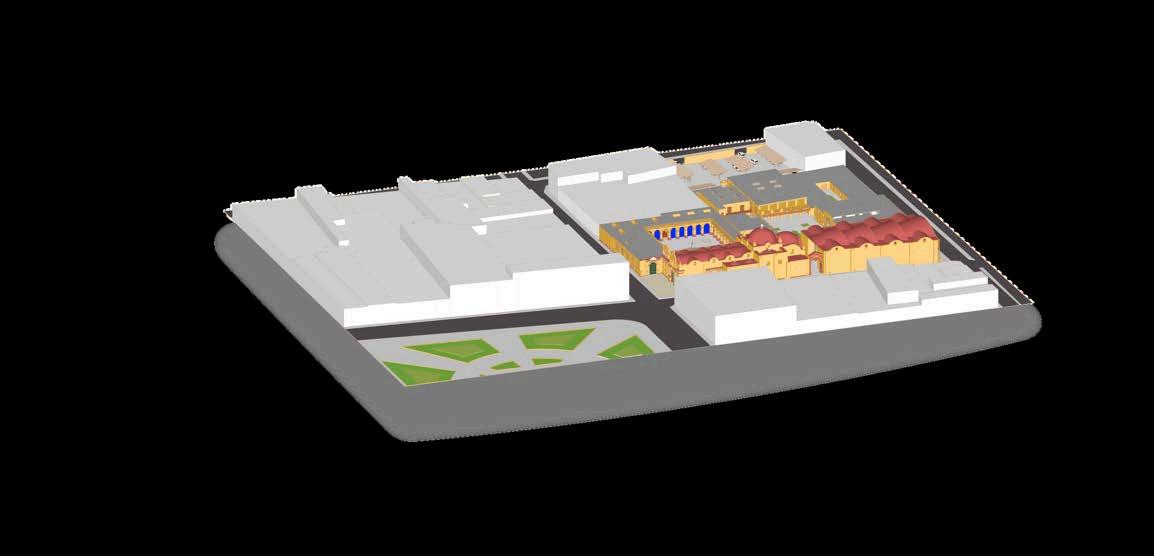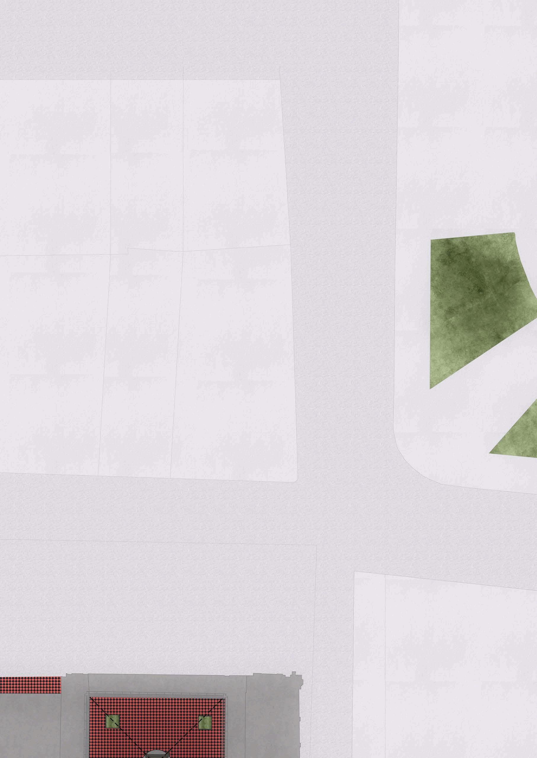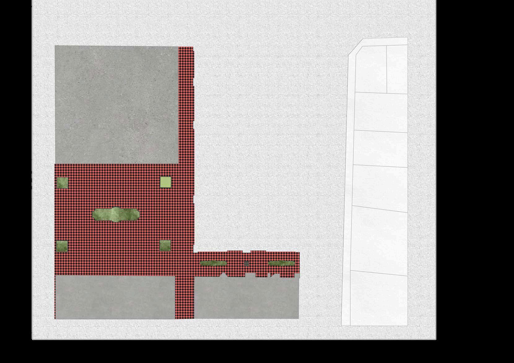 La estrategia complementaria se basa en la reinterpretación del patio inicial preexistente, adoptando su configuración como generador formal y funcionalparaelnuevopatiocentraldel proyecto. Este gesto permite organizar los bloques alrededor de un vacío articulador que actúa como punto de encuentro y distribuidor hacia las distintassubzonas.Almantenerlaforma y proporción del área verde central, se preservaelespíritudelantiguopatioque ocupaba esa ubicación, integrando la memoria del lugar dentro de la propuesta contemporánea. El nuevo patio central, junto con el patio subsidiario, establece un sistema de espacios abiertos que ordena el flujo interno, aporta claridad espacial y refuerzalarelaciónentrelosvolúmenes nuevos y los elementos conservados. Así,laestrategiadepatiosseconvierte enunrecursoclaveparaestructurarel conjunto,mejorarlacalidadambientaly consolidar una identidad común entre lasáreasdelproyecto.