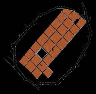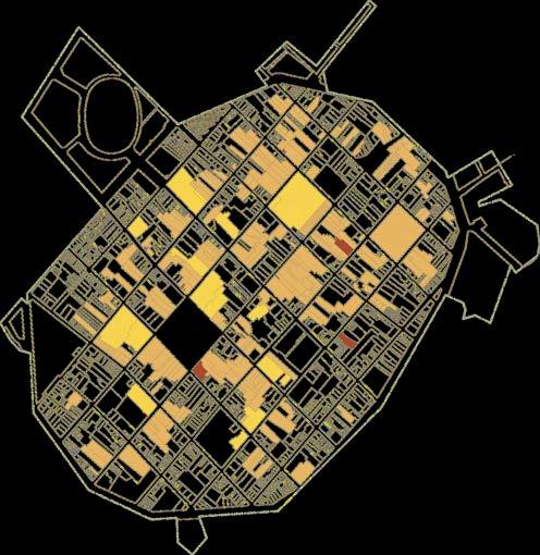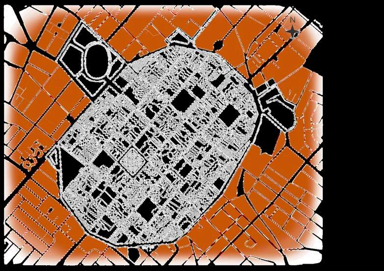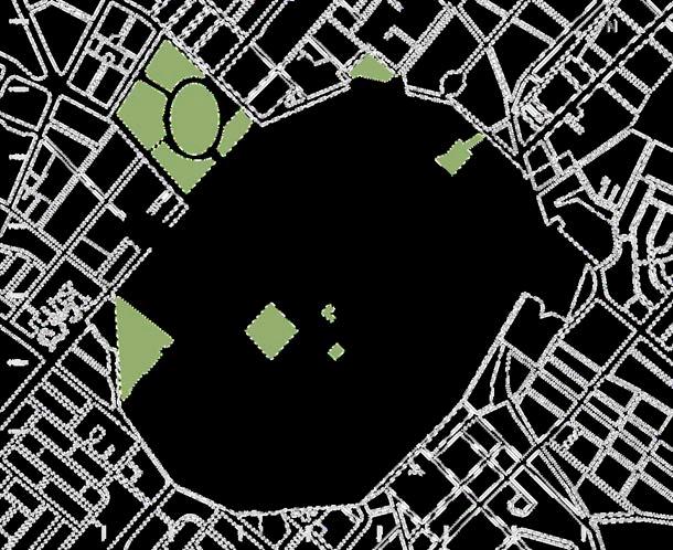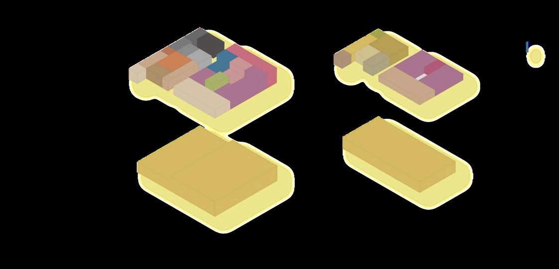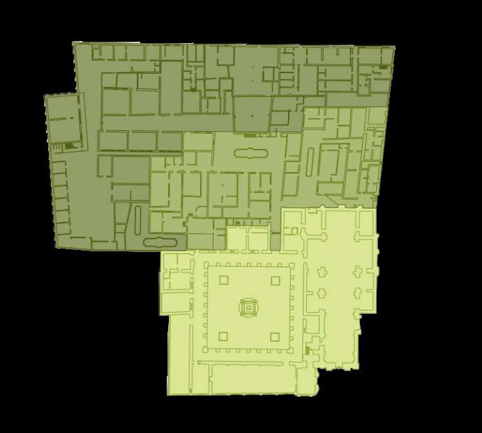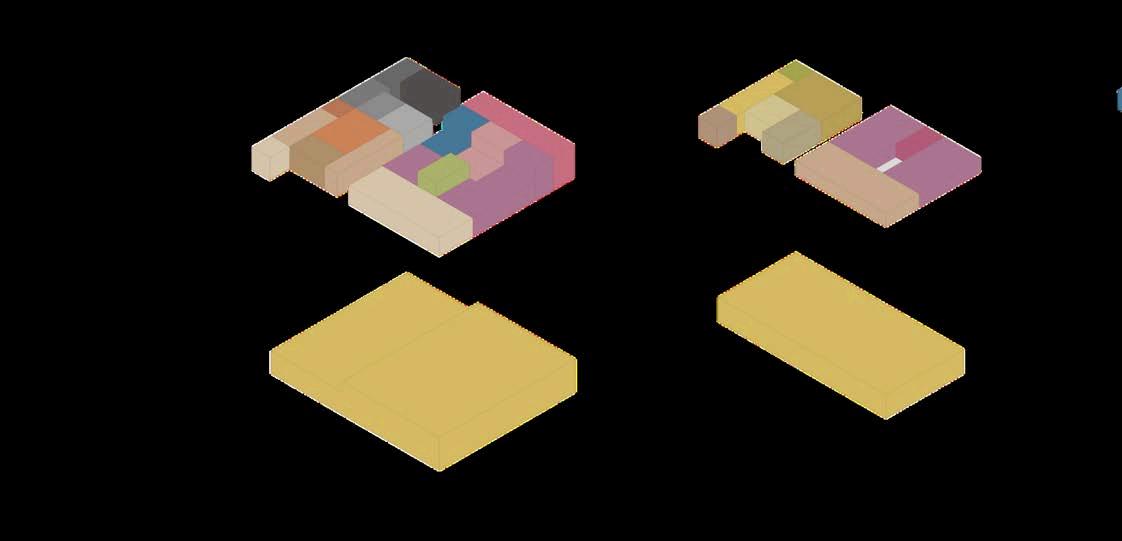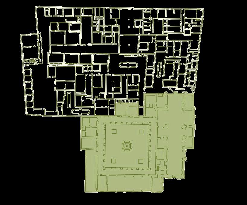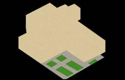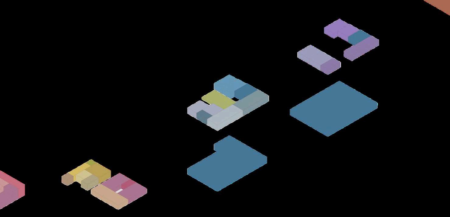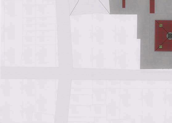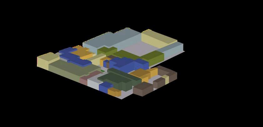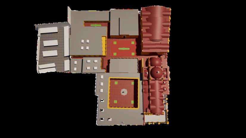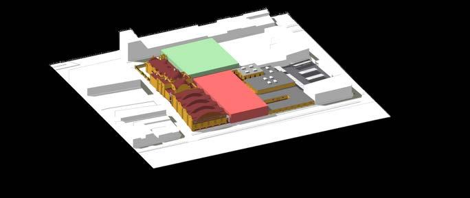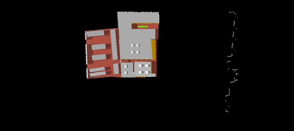 La estrategia complementaria se basa en la reinterpretación del patio inicial preexistente, adoptando su configuración como generador formal y funcionalparaelnuevopatiocentraldel proyecto. Este gesto permite organizar los bloques alrededor de un vacío articulador que actúa como punto de encuentro y distribuidor hacia las distintassubzonas.Almantenerlaforma y proporción del área verde central, se preservaelespíritudelantiguopatioque ocupaba esa ubicación, integrando la memoria del lugar dentro de la propuesta contemporánea. El nuevo patio central, junto con el patio subsidiario, establece un sistema de espacios abiertos que ordena el flujo interno, aporta claridad espacial y refuerzalarelaciónentrelosvolúmenes nuevos y los elementos conservados. Así,laestrategiadepatiosseconvierte enunrecursoclaveparaestructurarel conjunto,mejorarlacalidadambientaly consolidar una identidad común entre lasáreasdelproyecto.