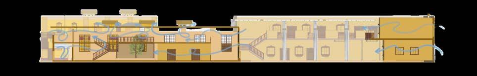 En cuanto a la ventilación, el edificio aprovecha sus patios centrales como núcleos de renovación de aire. Estas áreas abiertas facilitan el ingreso de corrientes de aire fresco que atraviesan los corredores y salas contiguas, creando un flujo constante que permite disipar el aire caliente acumulado. La diferenciadealturasentrelascubiertasy ladisposicióndevanossuperioresenlos murosfavorecenlaventilacióncruzaday el efecto chimenea: el aire caliente asciende y escapa por las aberturas altas, mientras que el aire más fresco entraporlaszonasbajas,generandoun ciclo de renovación natural. Incluso las cubiertasmodernasdevidrioquesehan añadido en algunos patios mantienen aberturas laterales o lucernarios para permitir esta circulación, evitando la acumulacióndecaloryhumedadenlos espacios interiores. Gracias a este diseño, el edificio logra una ventilación continua y eficiente, garantizando condiciones térmicas agradables sin dependerdesistemasmecánicos.