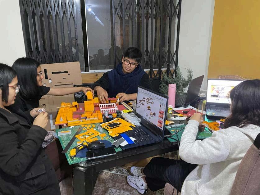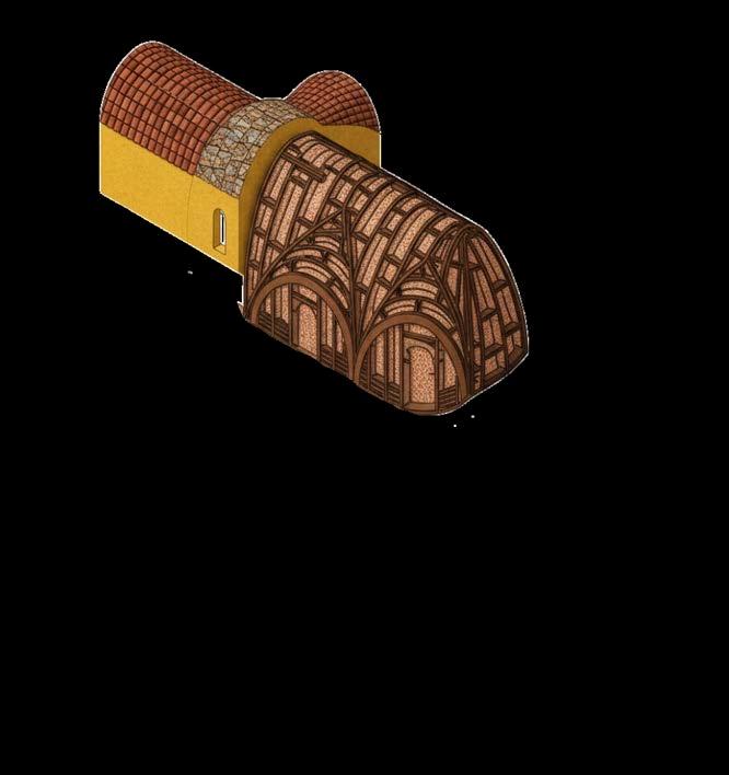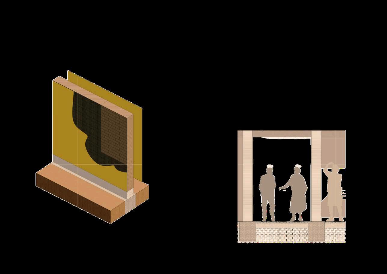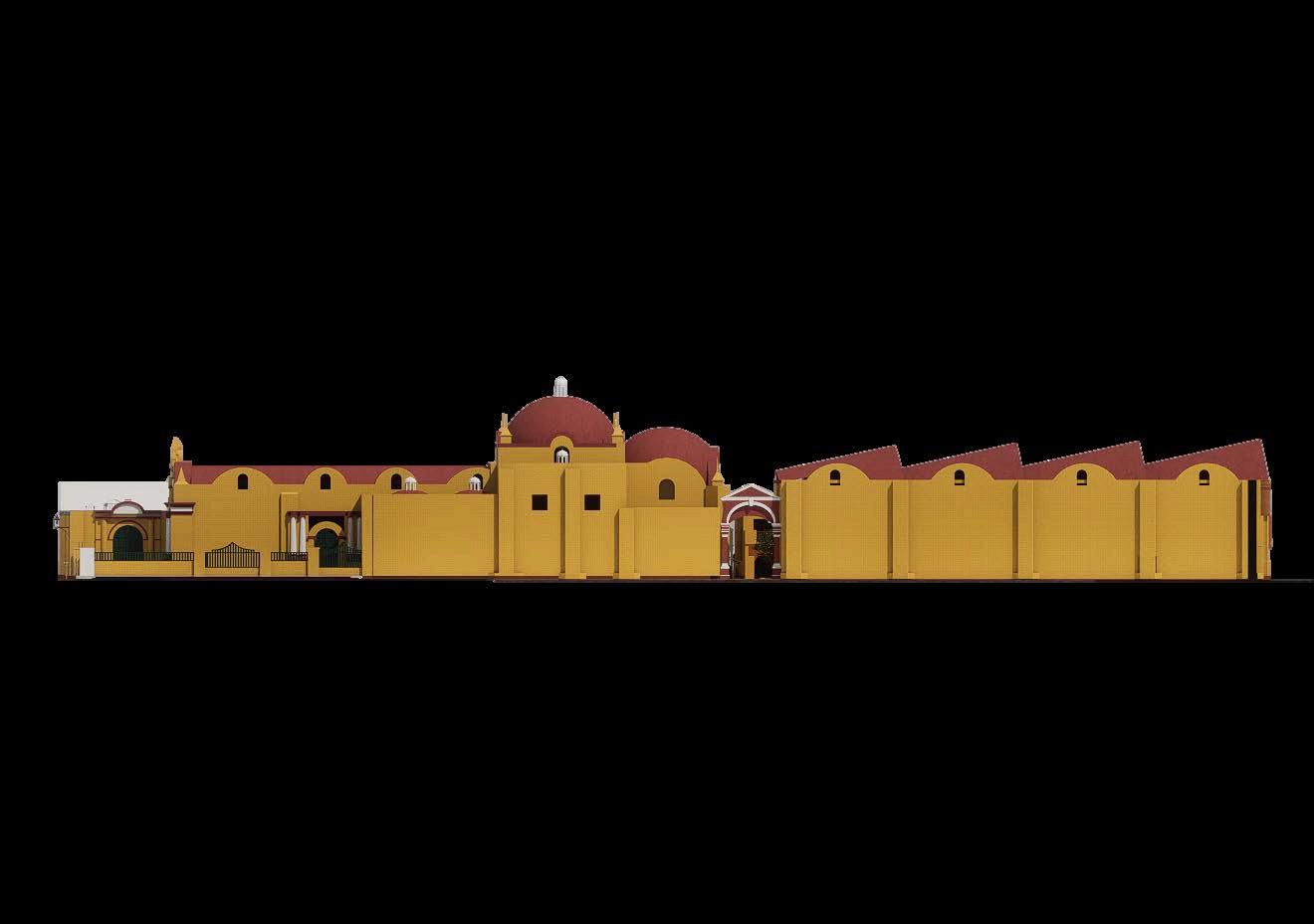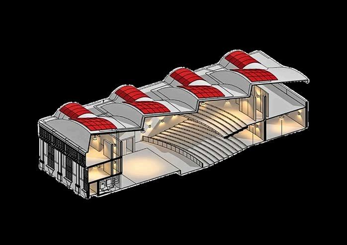 El nuevo teatro se concibe como una extensión conceptual del auditorio, retomando elementos claves como la forma del techo, los vanos y la modulacióndecolumnasparaestablecer unacontinuidadclaraenelperfilurbano de ese sector. Esta repetición no es mimética, sino adaptada a las proporciones y necesidades del programa teatral, generando una volumetríacoherentequedialogaconlo existente sin perder su carácter propio. Se emplean materiales tradicionales como adobe y quincha, reinterpretados con criterios contemporáneos para asegurar estabilidad y eficiencia, manteniendolaidentidadconstructivade lazona.Conestaestrategia,elteatrose integra naturalmente al conjunto arquitectónico,lograndoquelatransición entre lo preexistente y lo nuevo se perciba armoniosa, legible y profundamente vinculada al patrimonio materialyculturaldellocalcentral.