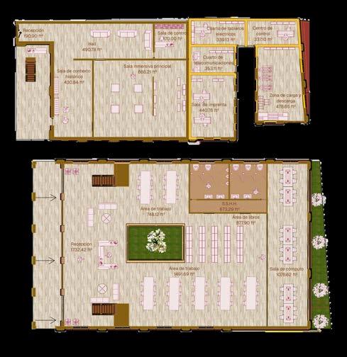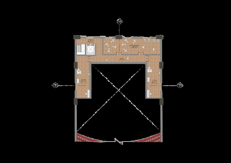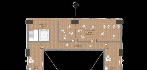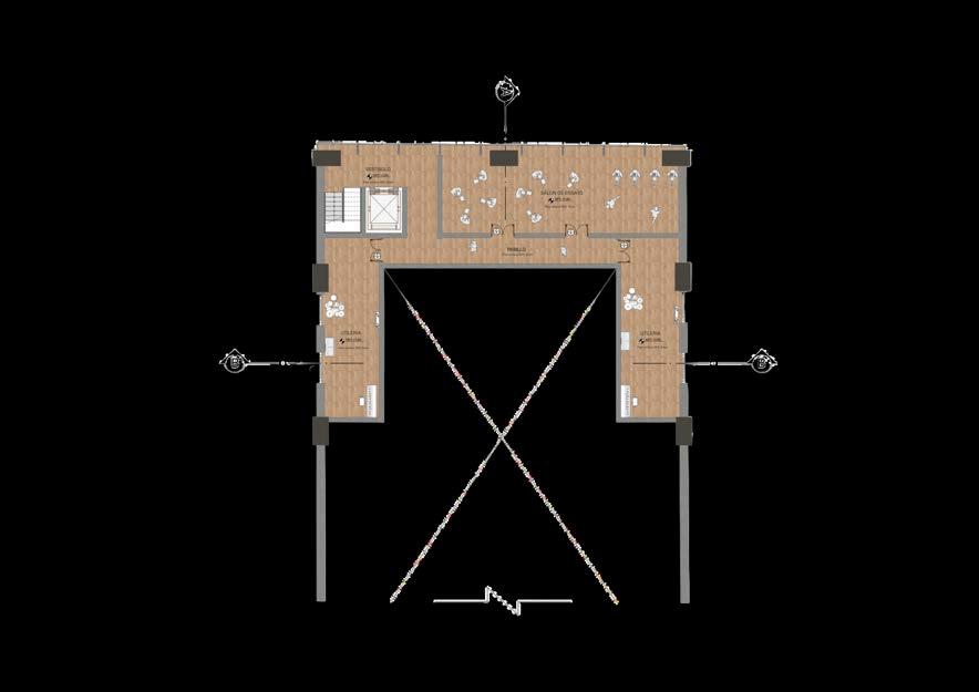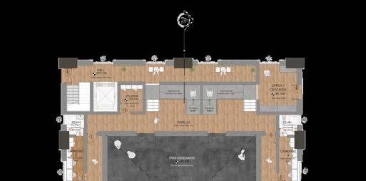 Esta combinación entre macro y micro circulación garantiza que el tránsito internoseaeficiente,evitandorecorridos innecesarios y facilitando la conexión directa entre las distintas áreas de trabajo.Almismotiempo,losnúcleosde circulación vertical, compuestos por escaleras y ascensores, refuerzan la relación con el vestíbulo principal, asegurandoaccesibilidaduniversal. Aunque la segunda planta tiene un caráctermásprivado,tambiénsereserva espacio para salas de reunión o ambientescolectivosquecomplementan las funciones administrativas. Estos espacios permiten interacción y articulación con la vida pública del edificio, pero en un contexto más controlado. La ubicación estratégica de lasáreastécnicasenbordesysectores discretosrefuerzalaoperatividad.