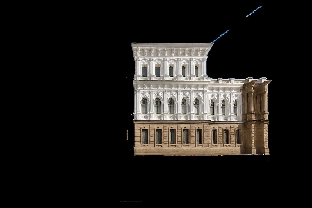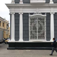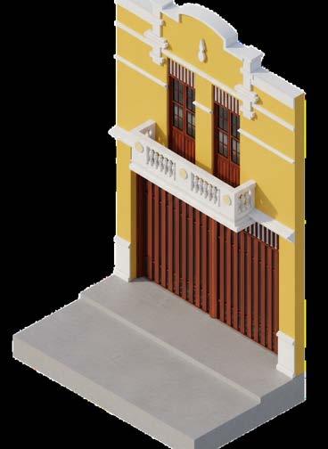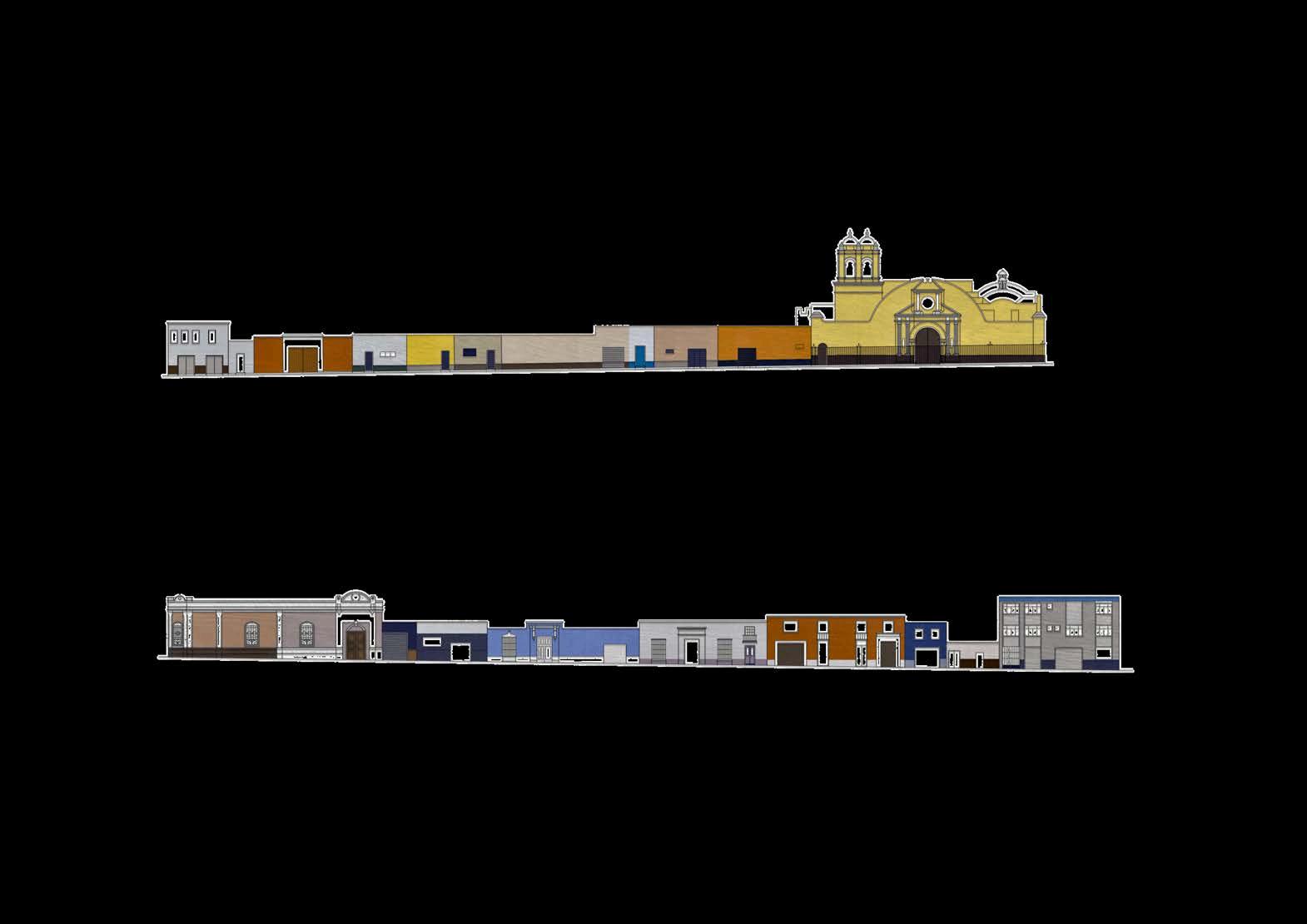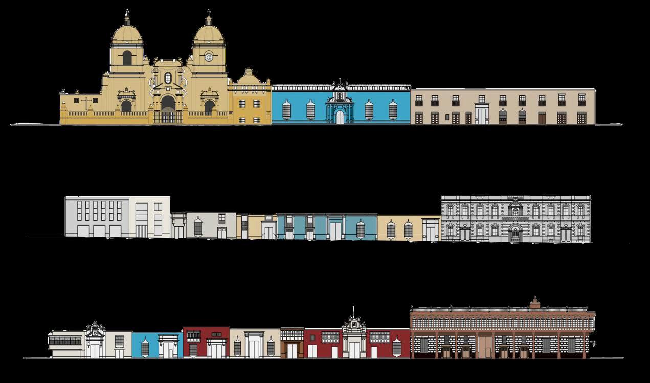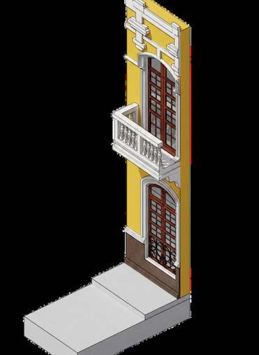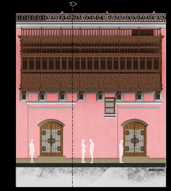 Hacia el perfil del Jr. San Martín se incorpora un sistema de balcones y se retoman las dos tipologías históricas de ventanas para generar una continuidad claraentrelaarquitecturaexistenteylas nuevas volumetrías, reforzando además la presencia rítmica de columnas que sobresalen del plano del muro para articular sombra, textura y profundidad.