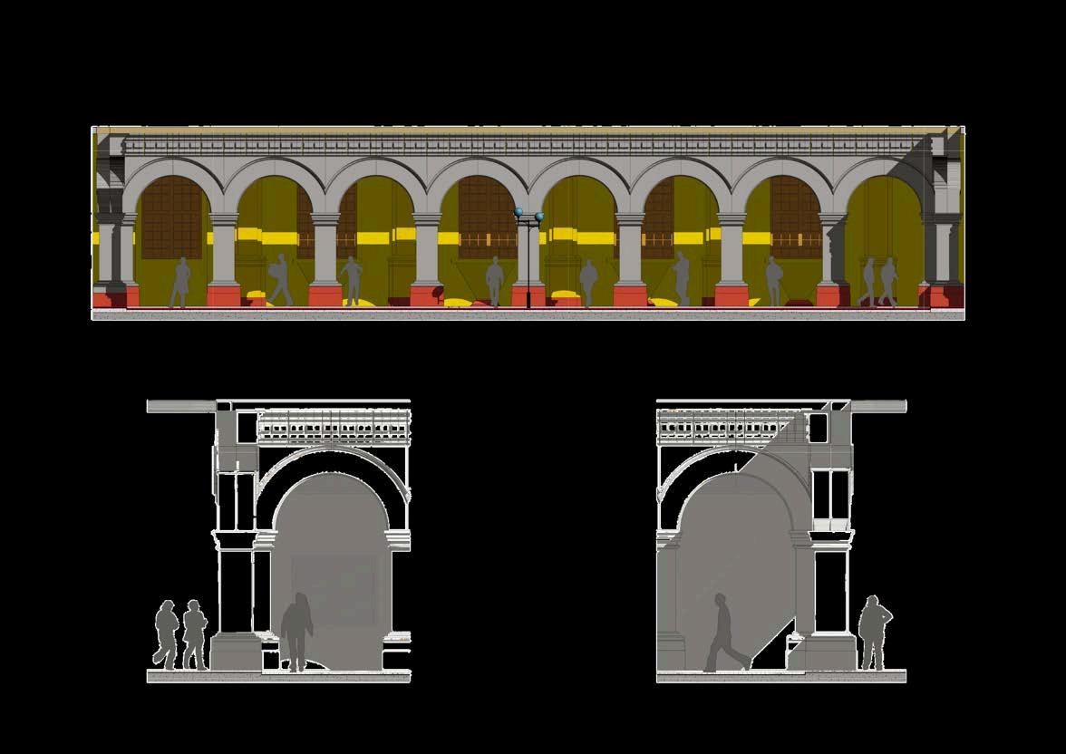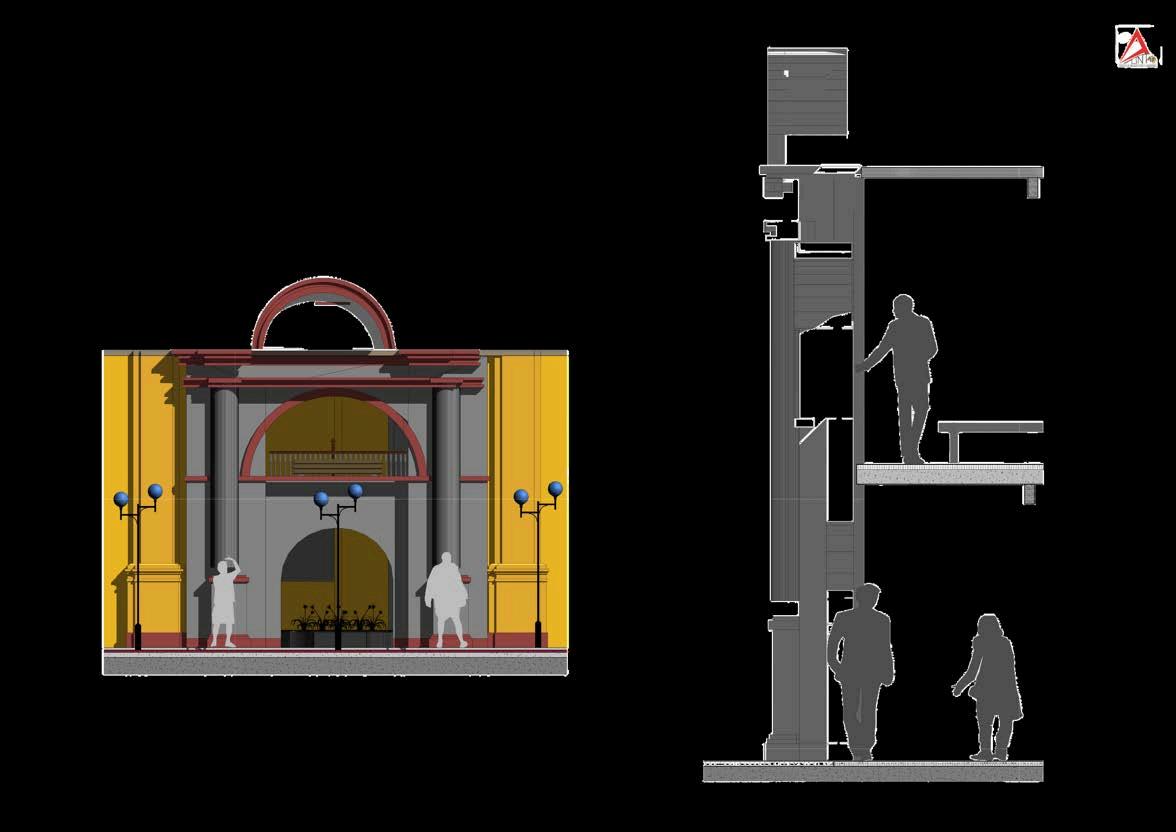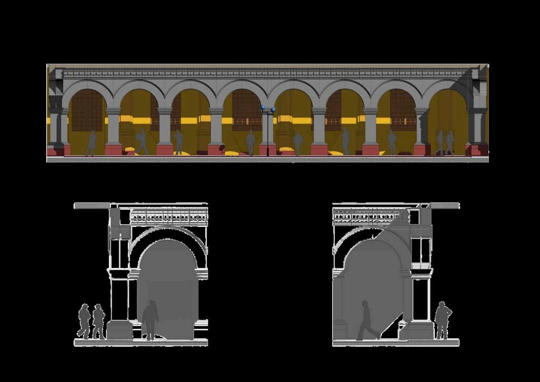 La propuesta retoma el arco como gesto recurrente para unificar la identidad del nuevo centro cultural: cada ingreso. Ya sea al museo, oficinas, biblioteca, aulas o teatro; se adopta esta geometría como un umbral simbólico que ordena y reconoce el carácter académico del conjunto. En los accesos principales, esta forma adquiere mayor escala, profundidad y tratamiento material, convirtiéndose en un hito de orientaciónqueguíaalvisitantehacia los núcleos más importantes del proyecto.Estaestrategianosolocrea unalecturacontinuaentrelasdistintas