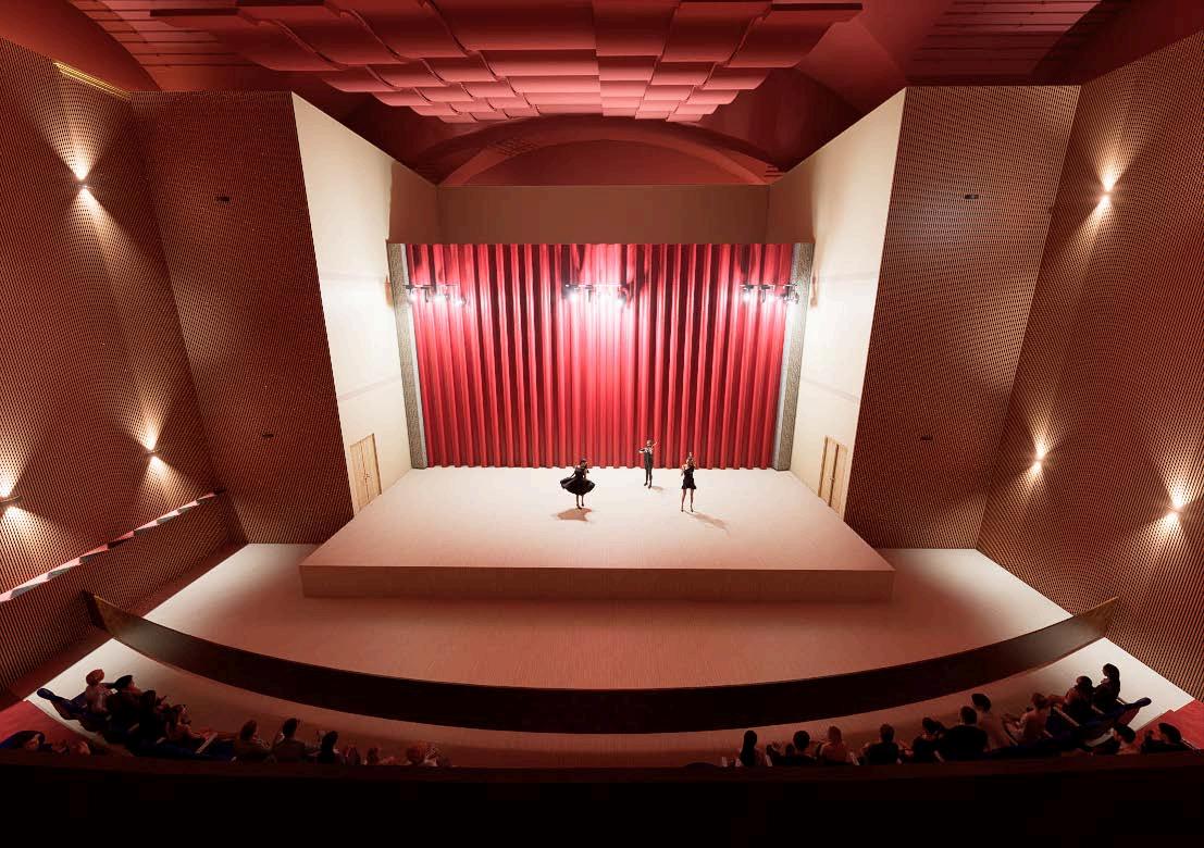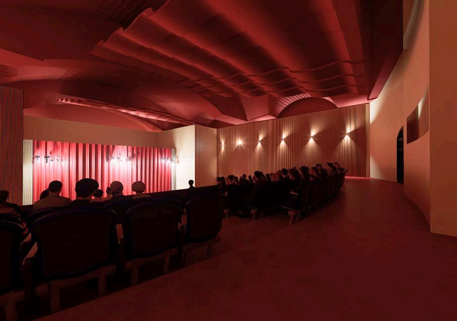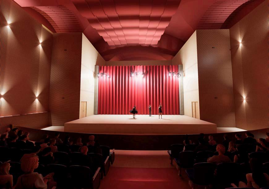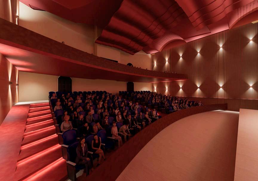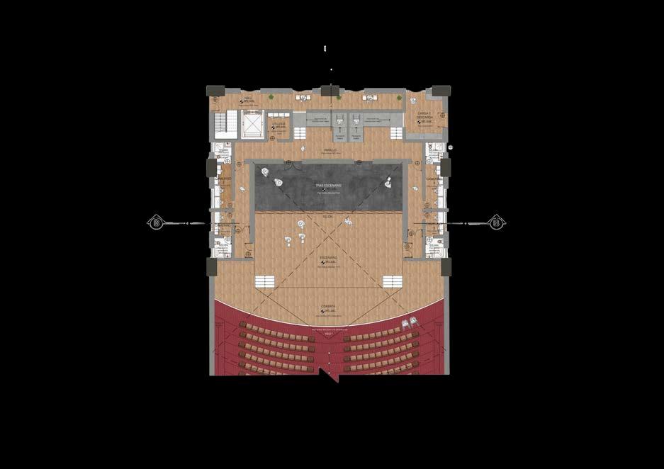 Se optimiza la relación entre escenario, graderías y circulaciones, incorporando accesos laterales más claros, zonas técnicas mejor integradas y una disposición que permite mayor flexibilidad para actividades diversas. Esta renovación no altera la esencia del volumen original,perosípotenciasucapacidad deadaptaciónysucalidadacústicay visual, generando una experiencia máscómodayfuncionaltantoparalos usuarios como para los artistas. Con ello,elauditoriosereafirmacomouno delosnúcleosculturalesdelconjunto, ahoraconunaestructurainteriormás contemporáneayoperativa.