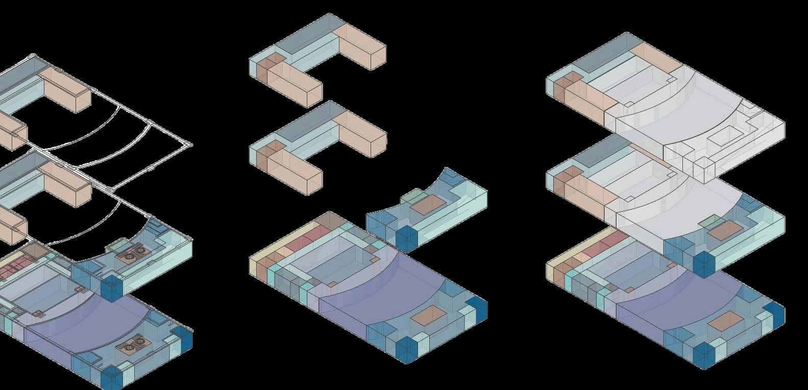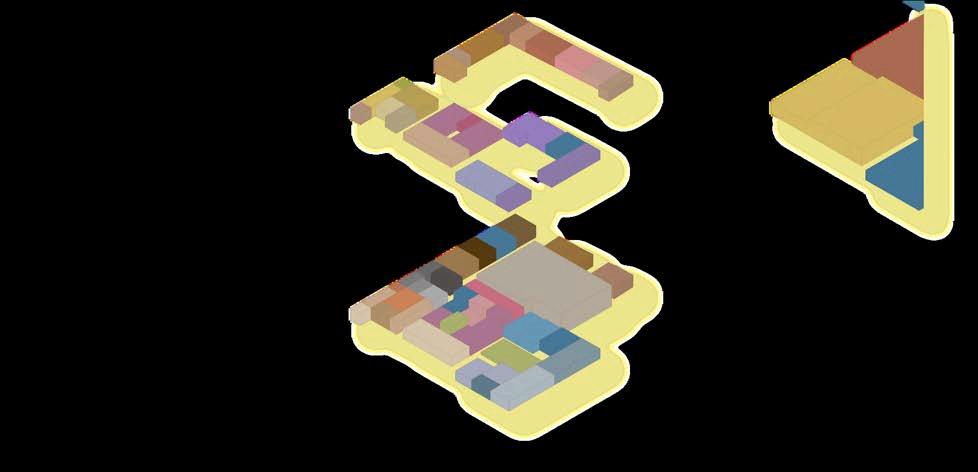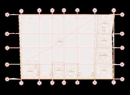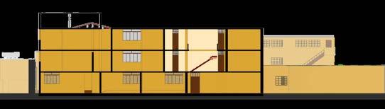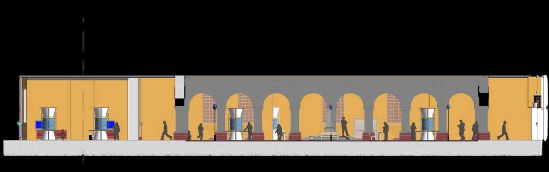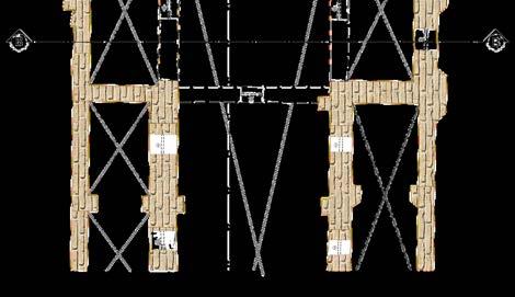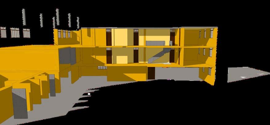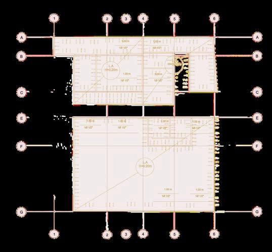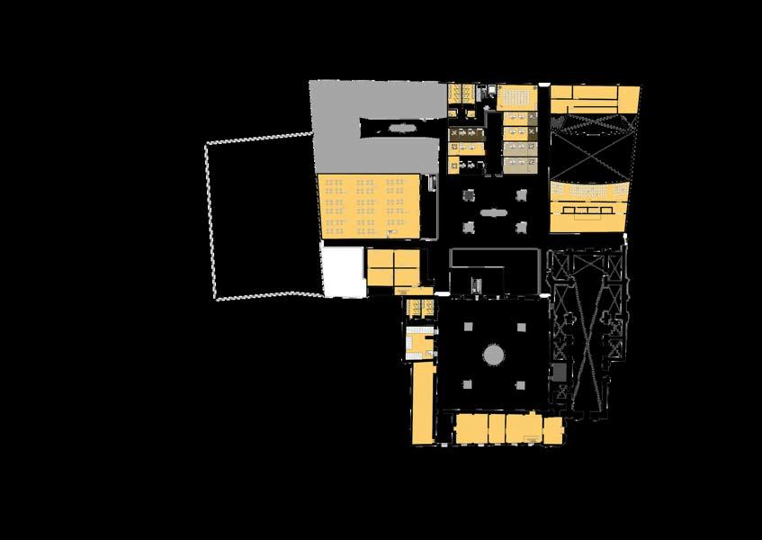Aellossesumanescalerassecundarias ydeservicio,destinadasalpersonal,al mantenimientooalaevacuaciónencaso de emergencias, asegurando así un sistemademovilidadcompletoyseguro. En los cortes también se hacen evidentes los recursos de iluminación y ventilación natural, como patios, lucernarios o vacíos que permiten vincular los diferentes niveles. Estos elementos no solo aportan confort ambiental,sinoquetambiénrefuerzanla orientación espacial del usuario, al ofrecer referencias verticales claras. La posibilidad de reconfigurar estos espacios, sumada a la flexibilidad estructural, otorga al edificio un alto potencial de reciclaje adaptativo, permitiendoqueconeltiempolosniveles puedan transformarse en función de nuevas necesidades sin perder continuidad ni coherencia en su circulación.