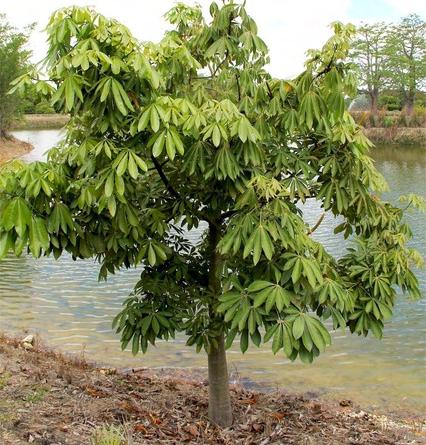 Presenta hojas de color verde oscuro, con aspecto coriáceo