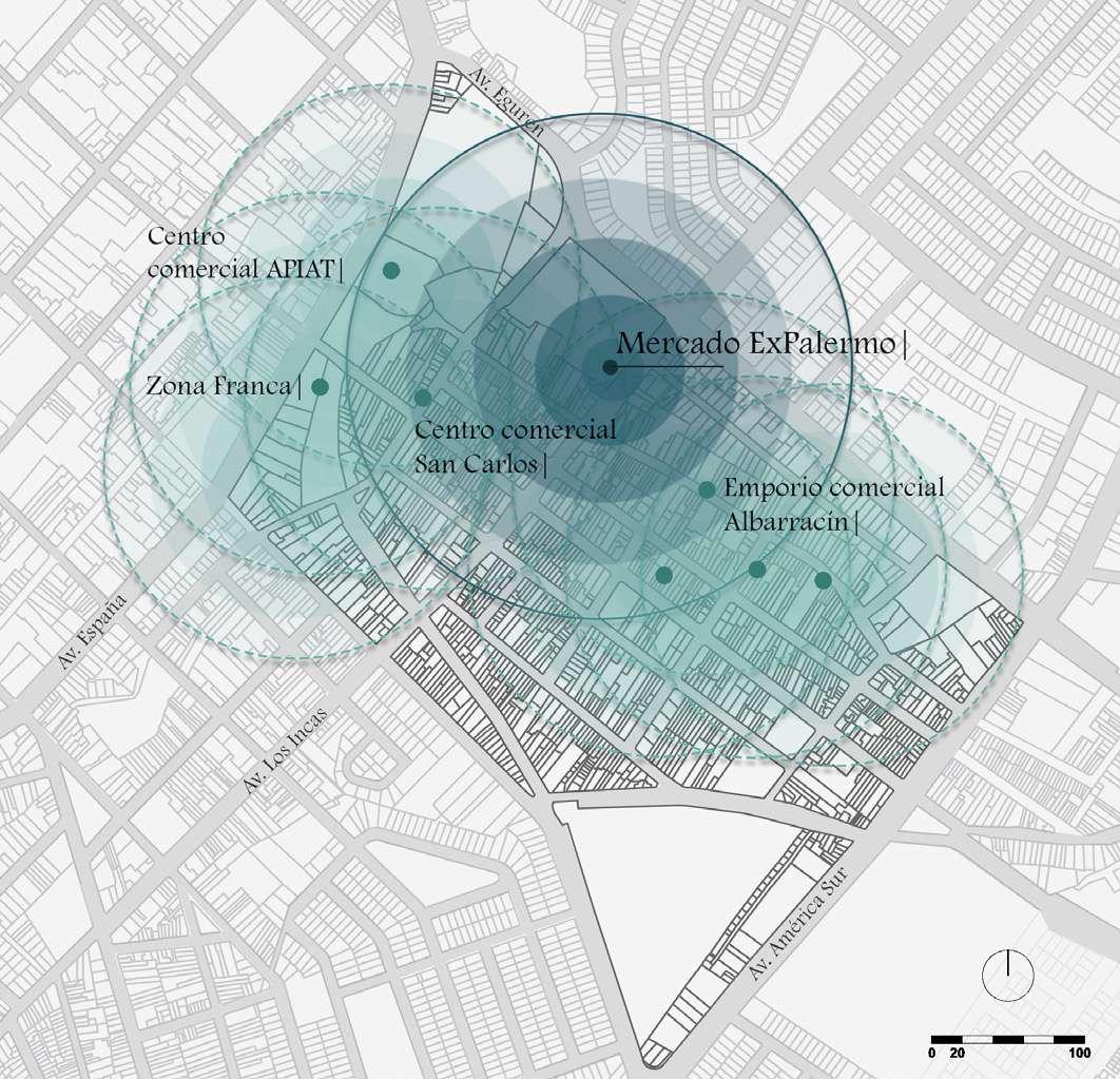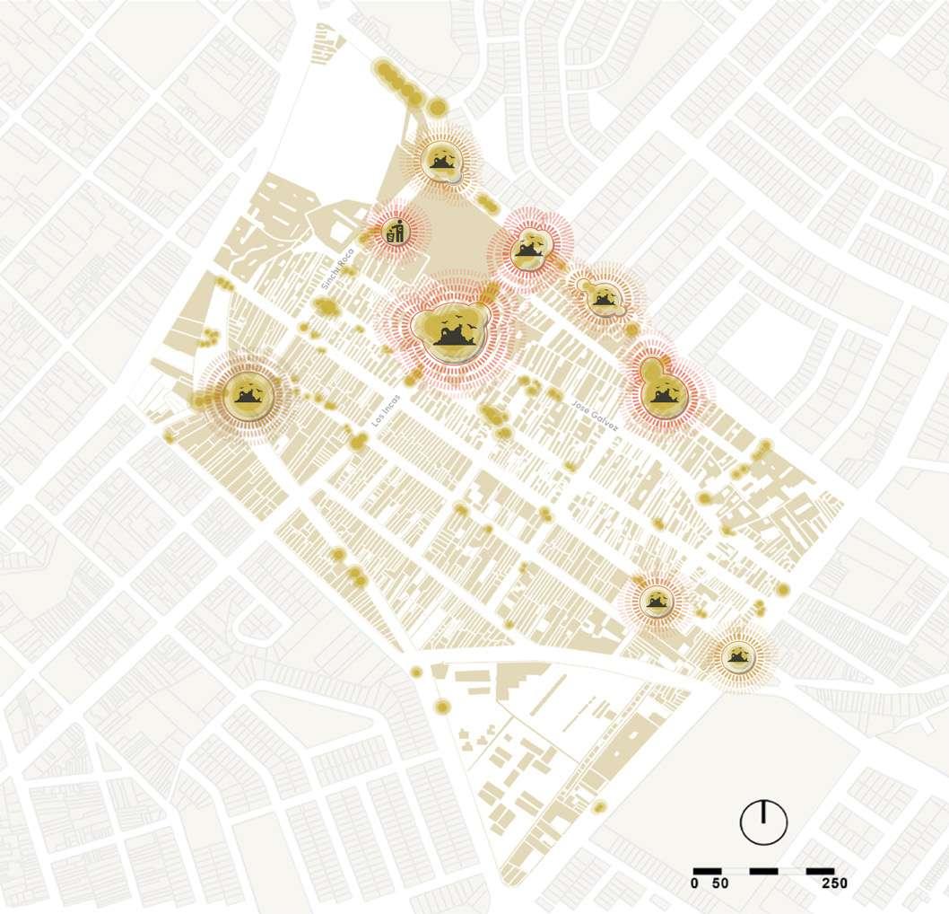 El área de intervención de acuerdo a su proximidad cuenta con hitos importantes como escuelas, mercados, centros comerciales que existen tanto fuera y dentro del sector, los cuales activan el funcionamiento tanto de la ciudad como del mismo usuario.