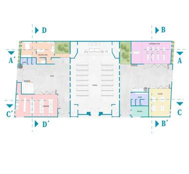 Mediante esta sección podemos notar la espacialidad de las áreas, en este caso se denota los bloques del SUM unidas con el patio quesirvecomoespaciointermediarioparaniños de diferentes grados y edades, a la vez se muestra como la vegetación conforma los espaciosysemantienepresenteauncuandoes elproyectosehaimplandoenelcentrocomunal parroquial, mostrando la importancia de lo natural. Asi los espacios tienen la configuración de abrirse al exterior mediante el uso de diferentes tratamientos en los cerramientos de muros, denotando la celosia de ladrillo que ayude a mantener esta conexión, pero a la vez filtre un poco el aire y este no llegue a afectar completamenteelespaciointeriordelossalones deusosmúltiplesyeltalleryaquesedebetener en cuenta esta clase de condiciones al asentarnos en un contexto de clima como es Huanchaco es tropical y se necesita bastante ventilaciónparaenfriarpordentro.