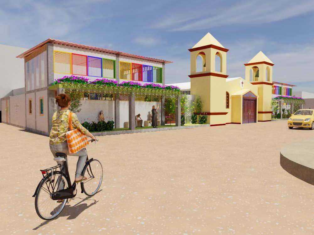 Desde una vista mas subjetiva, este proyecto busca que tanto el ámbito social como religioso caminen de la mano es por ello que se crean espacio de salones múltiples que buscan crear pequeñas sensaciones a través del color y materialidad, asi experimentar para desarrollar sus capacidades cognitivas. Se emplearon para las ventanas un madera OBS que tiene casi la misma textura que el corcho, la sensación que expresa el lugar es de naturalidad, la tranquilidad y los tonos que contrastan la madera con los colores de la ventana, hacen que el espacio sea iluminado como un juego de luces, tambien el diseño del mobiliario se va ideando que pueda configurarse de diferentes formas y sea flexible para acceder a diferentes opciones de organización al momento de sentarse, permitiendo que se adapte con mayor facilidad a las actividades o taller que se dictan, como rondas de carpetas, que se coloquen de manera individual o se agrupen de 3,4, o 5. Asi queelmobiliariodebeserligero,duraderoyfácil de manejar para cualquier tipo de usuario incluyendo a las personas con discapacidad. Luego, desde la vista de la entrada se presenta una especie de recibidor con un cubierta donde lacomunidadpuederefugiarsetantodelalluvia como del sol, generando una sensación de protección.