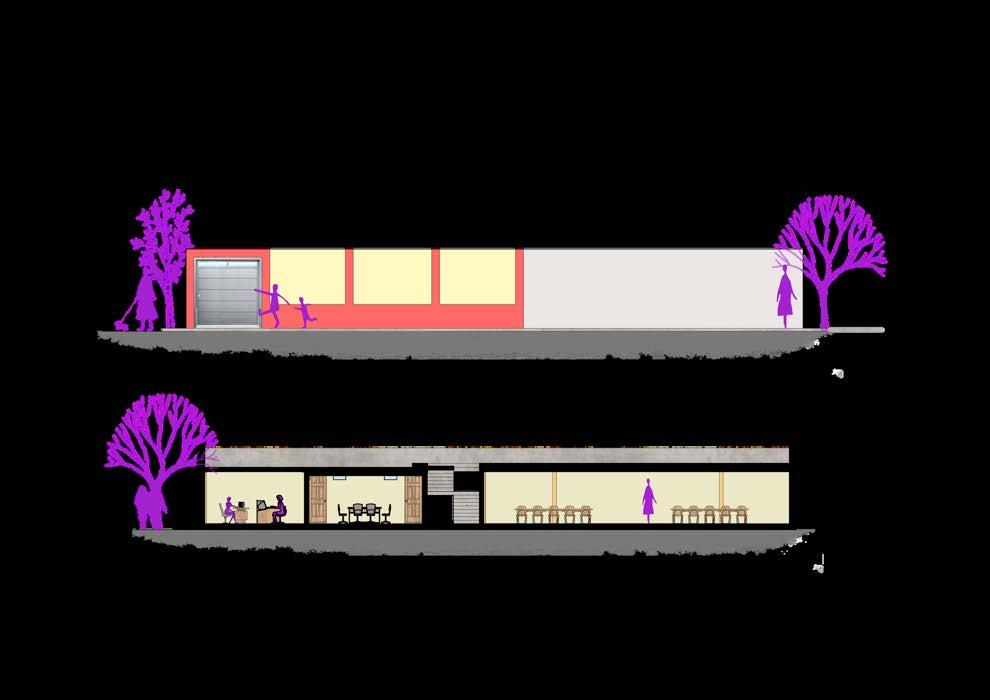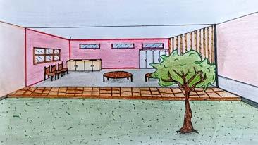 Porotrolado,elHalldeingresoesunespacioquesirvede intermediarioentrelaSaladeusosmúltiplesdelaprimera planta y el patio que se abre hacia la calle, generando así la sensación de amplitud de la primera planta y continuidad con el espacio exterior, por ello esta zona permite la realización de actividades recreativas e integradorasporsupermeableaccesoconlacomunidad.