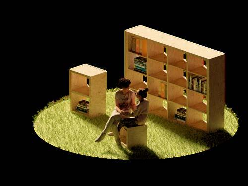 Estemobiliariofuediseñadoespecialmentepara que los niños pudieran leer y a la misma vez divertirse, se busca una manera de fomentar la lectura pero sin tener que ser aburrida, en conjunto va el mobiliario para colocar libros, llega hacer tan versátil y flexible, ya que son cubos puestos sobre otros, quiere decir que el mobiliario se va a transformar de acuerdo al gusto del usuario, y eso lo hace interesante a este mobiliario. Su construcción es sencilla ya que para la amaca se coloca una red especialmente para que no sea incomodo para niños, y sea seguro a la misma vez. Esto llama bastante la atención a los niños ya que para ellos le gusta estar en lugares altos que representen el peligro. Por consiguiente para los cubos de la biblioteca se hace de retazos de maderayselijanparadarleunatexturasuavey
