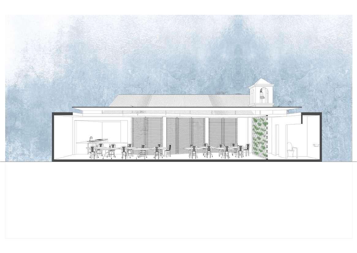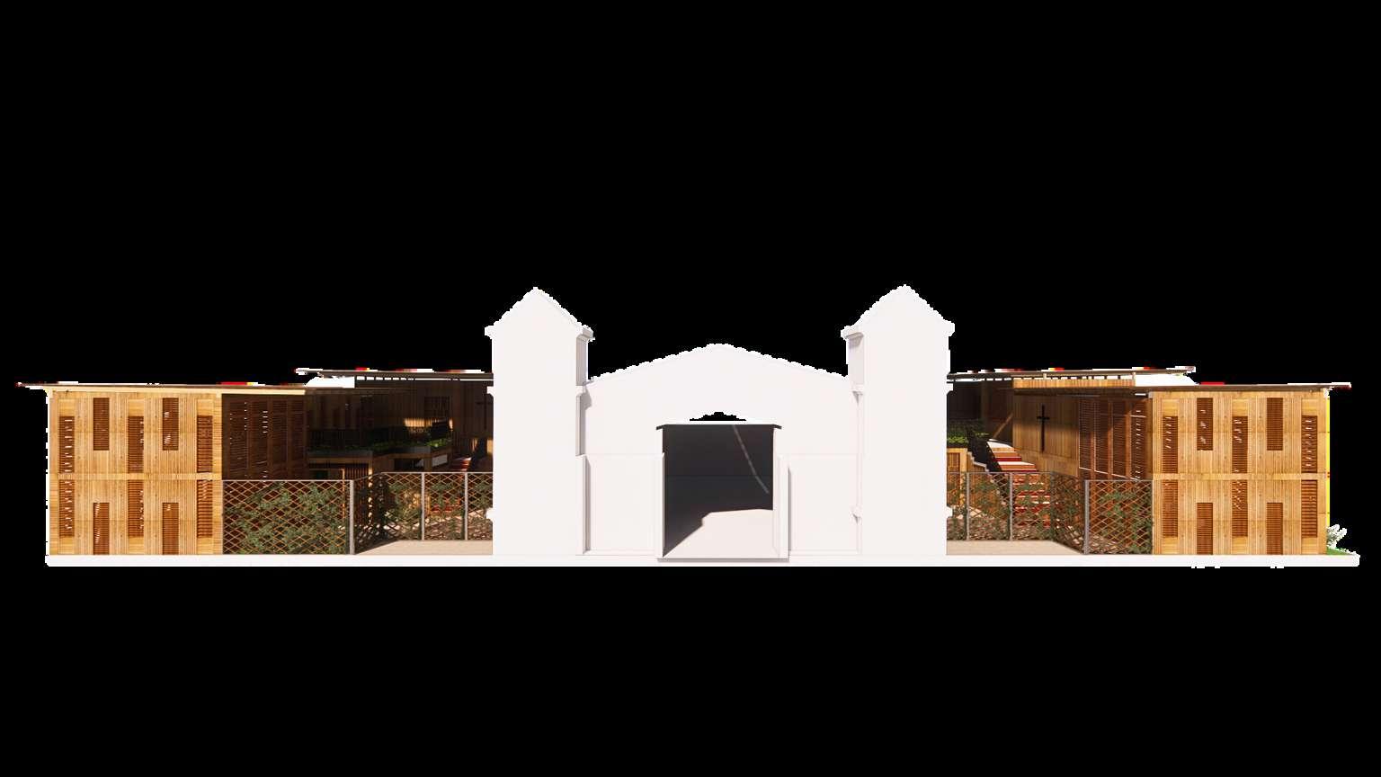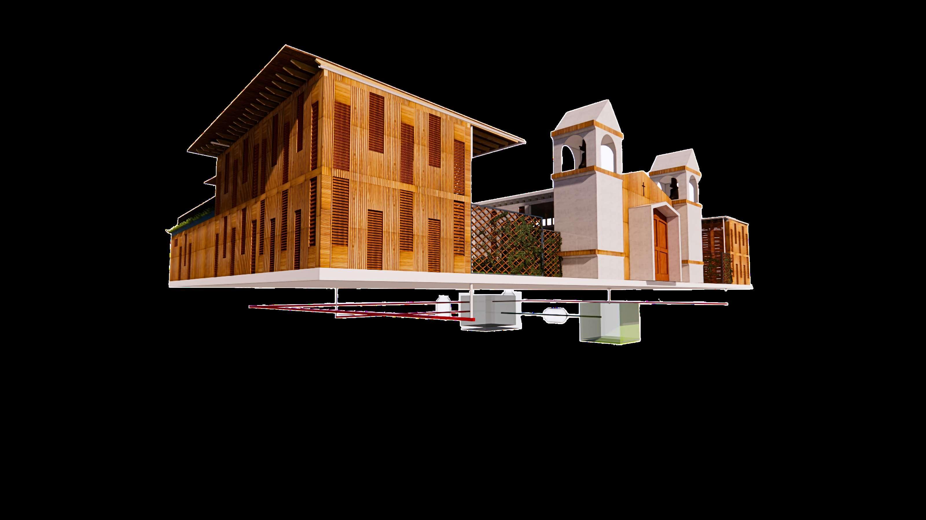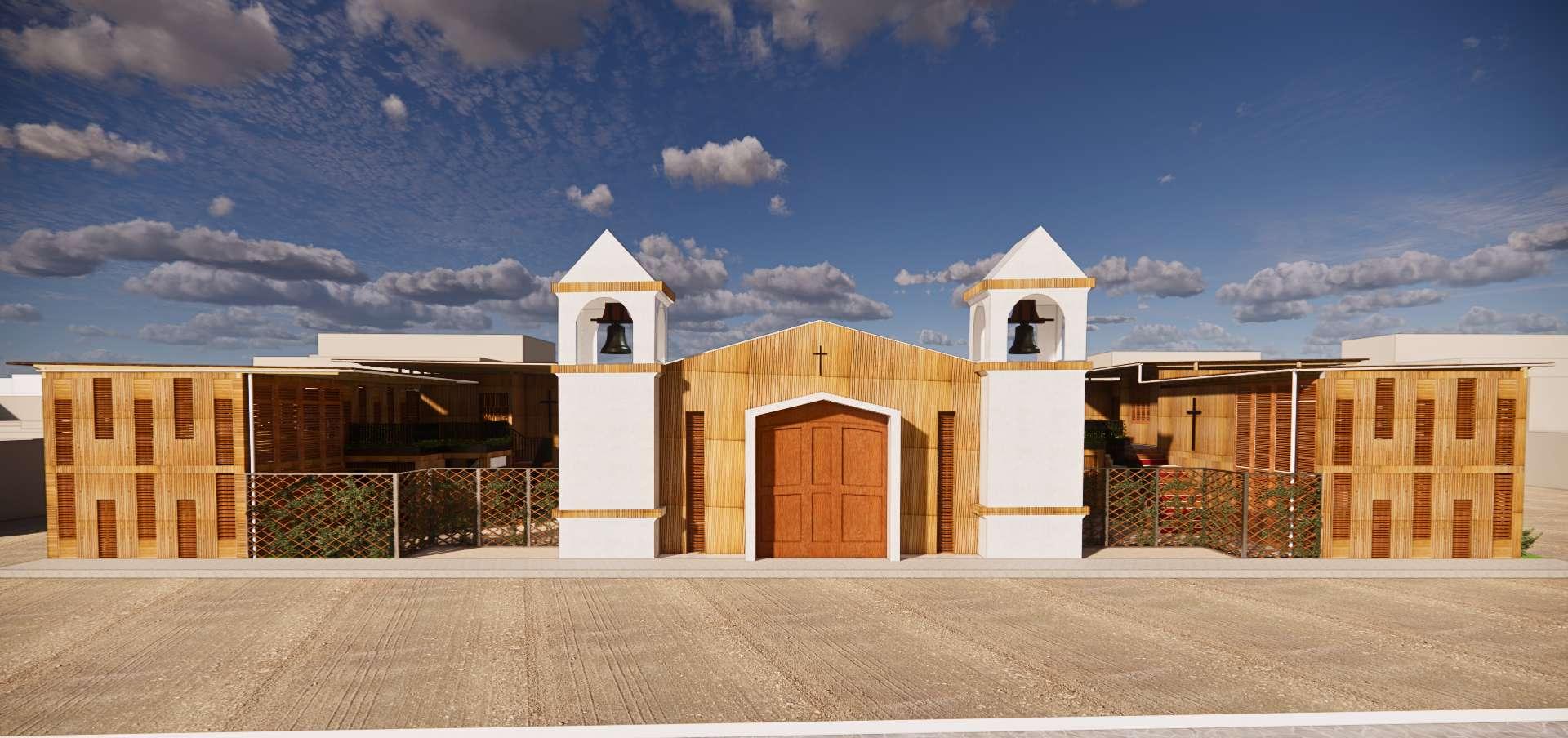 Así como, en esta segunda fase se hizo el d seño de la glesia que ya se encontraba construida pero se necesitaba de unos ajustes y una remodelación. Por lo que, en este diseño la fachada de madera al exterior que es de madera va en conjunto con e resto de proyecto. Además, a os costados para a vent lación y a i uminación se ut l zo e mismo tratamiento de vanos en cuanto a su mater al de madera. En e nter or se busco un espacio acogedor ya que este es el corazón y centro de este proyec o donde as personas van a interactuar a mayor parte del t empo.