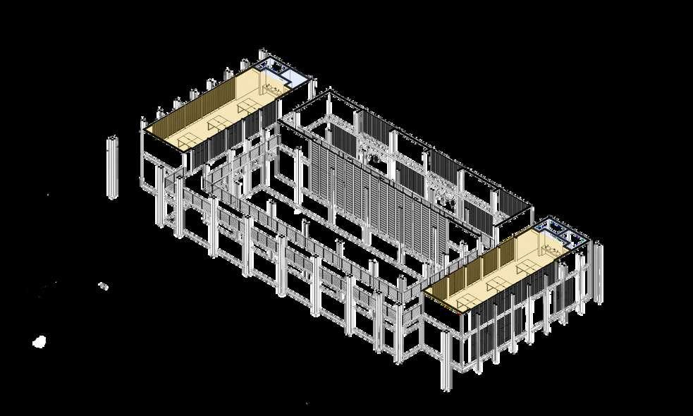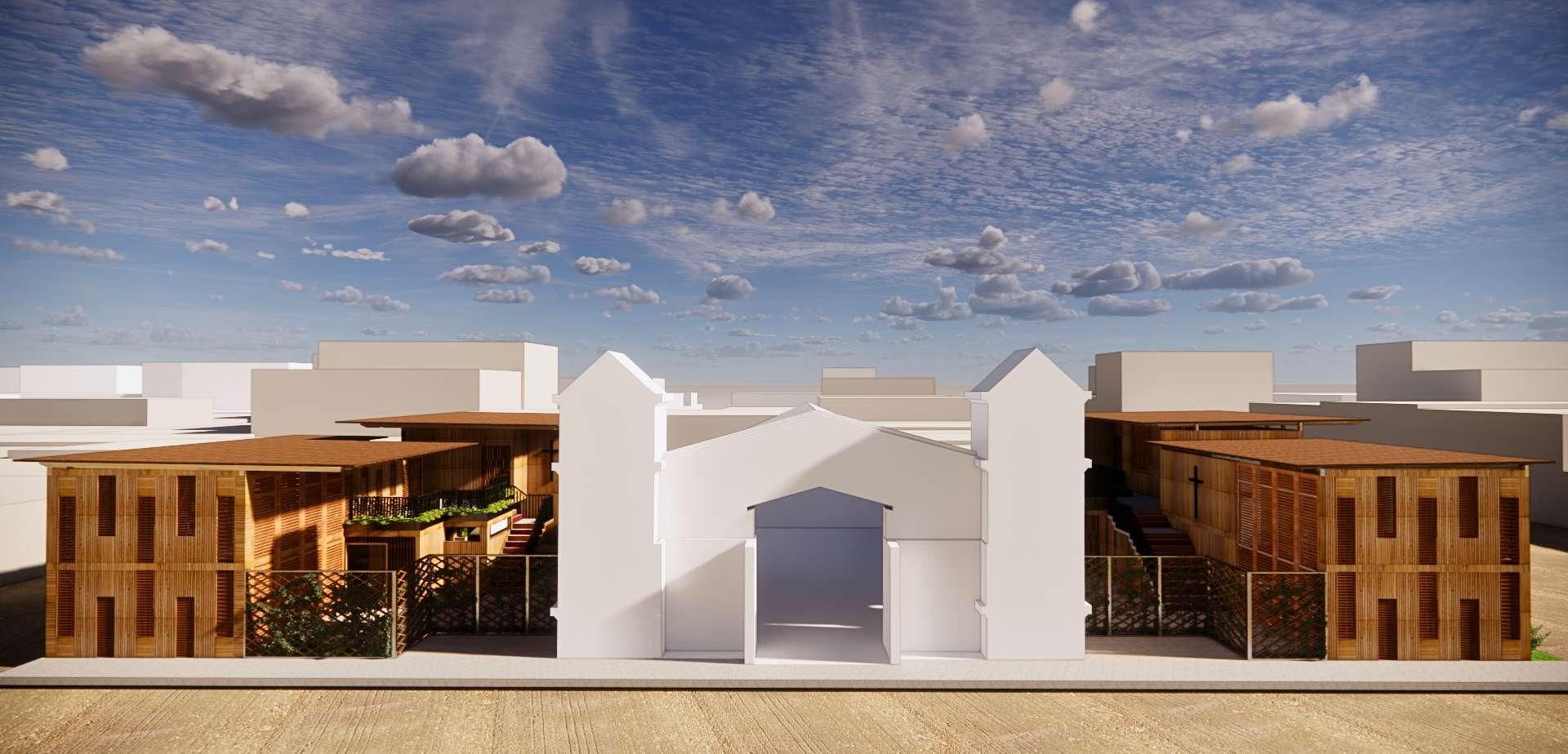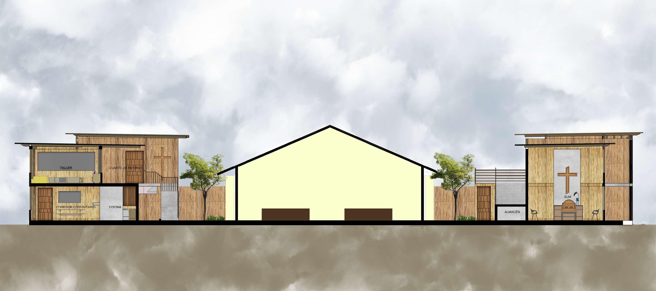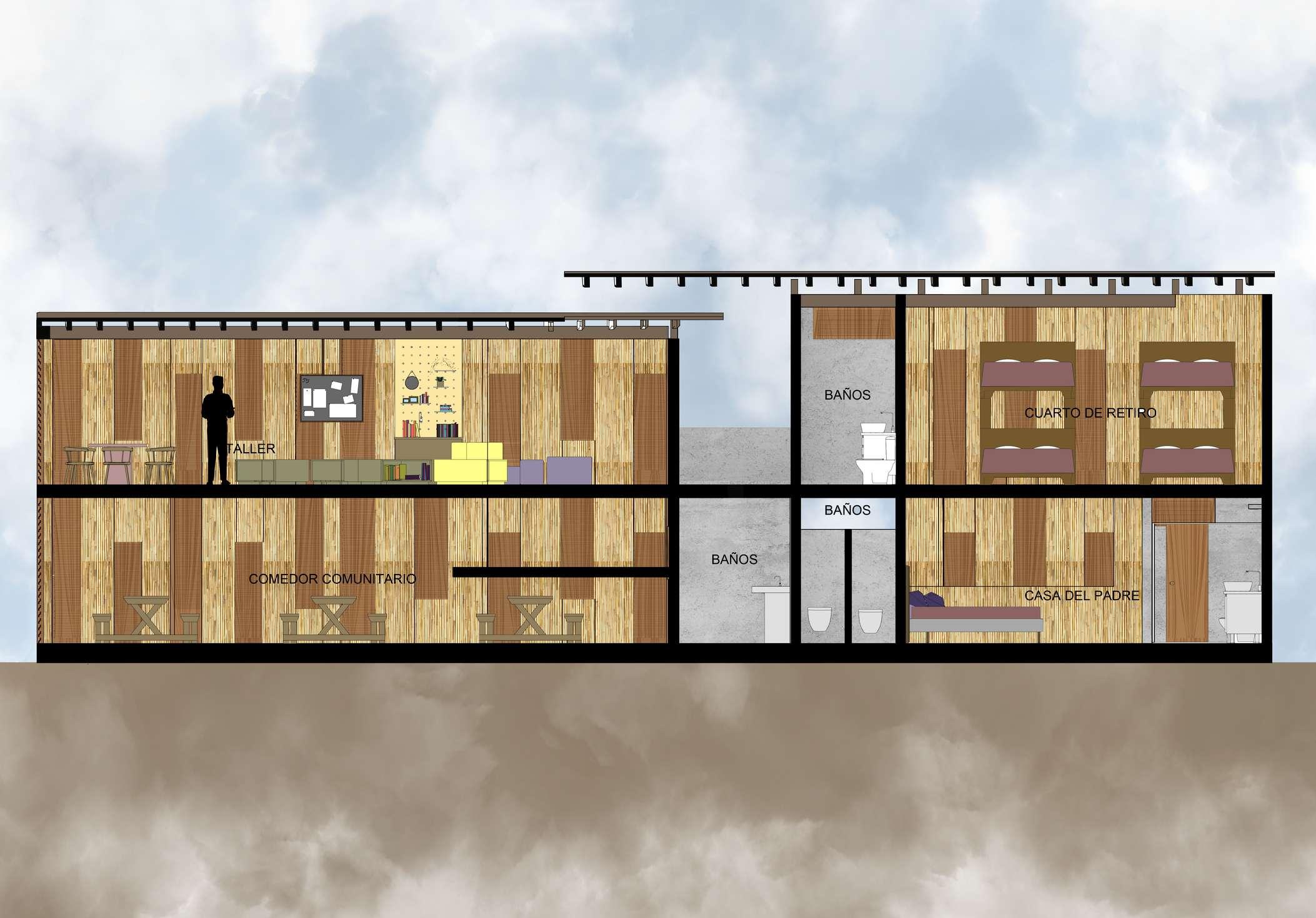 Así como, en esta segunda fase se hizo el d seño de la glesia que ya se encontraba construida pero se necesitaba de unos ajustes y una remodelación. Por lo que, en este diseño la fachada de madera al exterior que es de madera va en conjunto con e resto de proyecto. Además, a os costados para a vent lación y a i uminación se ut l zo e mismo tratamiento de vanos en cuanto a su mater al de madera. En e nter or se busco un espacio acogedor ya que este es el corazón y centro de este proyec o donde as personas van a interactuar a mayor parte del t empo.