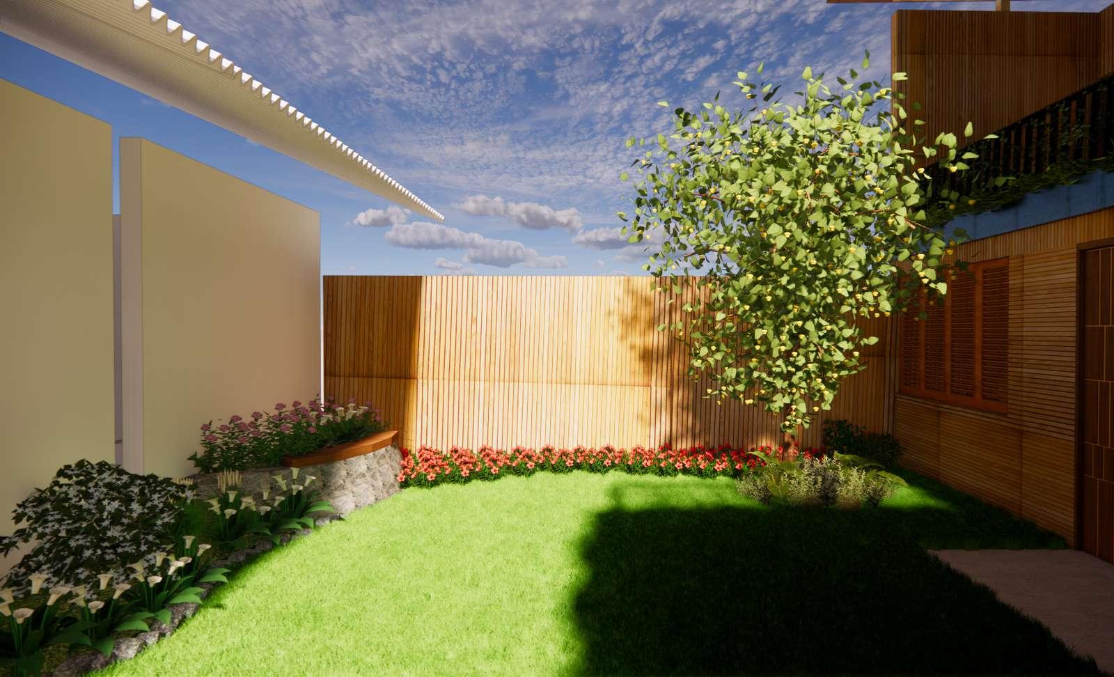 Para el ado izquierdo del proyecto podemos encontrar dos patios, uno ub cado a ado de la esca era y que da paso con un cam no de p edras a os baños, as como otro pat o ub cado en la casa del padre y que sirve como su huerto persona .
