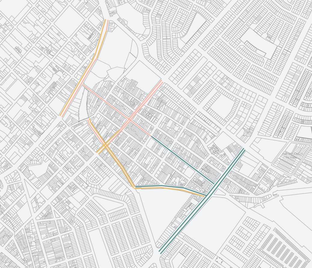 Aquí como en gran parte de la ciudad, la trama urbana es irregular esto debido a que las avenidas no tienen un orden particular o una forma geométrica definida, sin embargo por las calles del sector podemos decir que hay una cierta tendencia ortogonal que da sensación de orden.