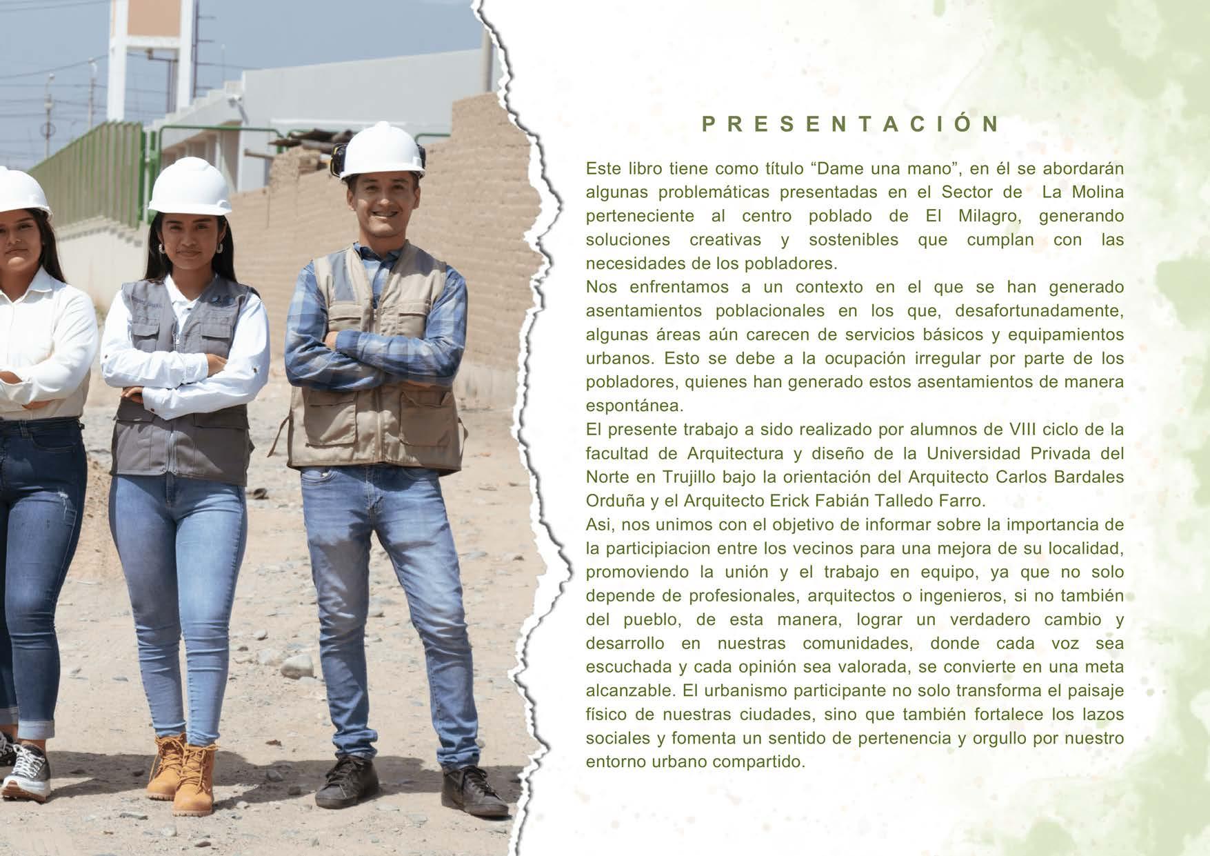 “MANO, DAME UNA MANO” es un Libro elaborado por un Grupo de Estudiantes del Taller de Arquitectura 8 (TA8) de la Universidad Privada del Norte (UPN) Sede Trujillo, durante el Semestre Presencial 2024-1 y sintetiza nuestra Propuesta de Plan Específico para el Sector La Molina, Centro Poblado El Milagro, Distrito de Huanchaco.