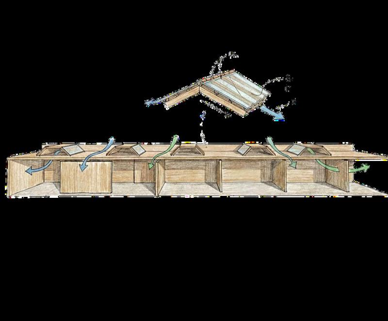 La eficiencia energética del proyecto se aborda a partir de estrategias pasivas integradas al diseño arquitectónico, priorizando el aprovechamiento de las condiciones climáticas del entorno. La disposición de los volúmenes y la orientacióndelosespaciospermitenuna adecuada ventilación natural, favoreciendolarenovaciónconstantedel aire y reduciendo la dependencia de sistemas mecánicos. Esta configuración contribuye a mejorar el confort térmico interior y a disminuir el consumo energético durante la etapa de uso del edificio.
