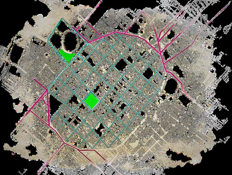 Elpatrónurbanísticooriginalseestructuró en torno a la Plaza Mayor, rodeada de edificios administrativos, religiosos y viviendas de familias influyentes. El trazadoortogonalpermitióunaexpansión ordenada, delimitada por murallas defensivasconstruidasenelsigloXVIIpara proteger la ciudad de ataques piratas.