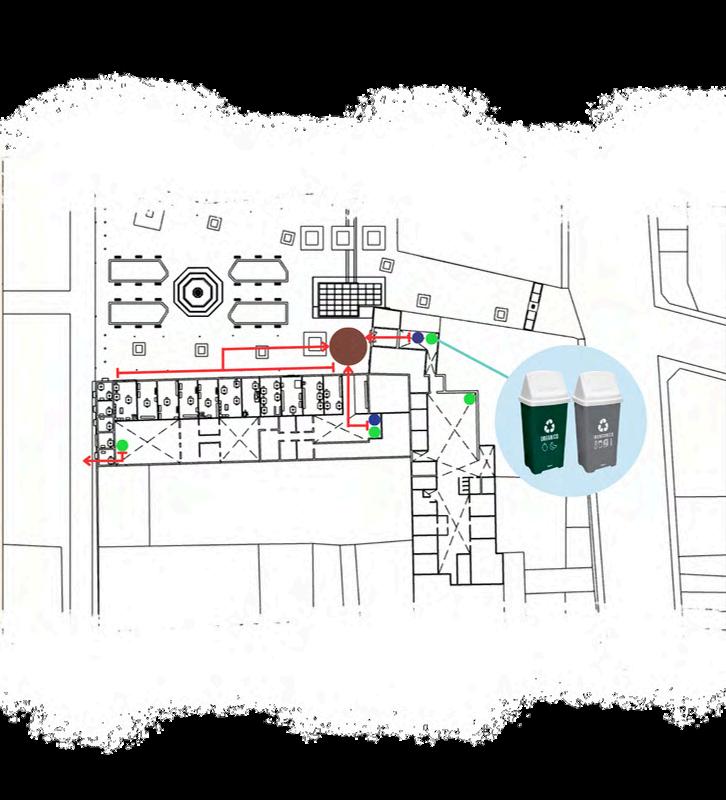 El proyecto incorpora un sistema de gestión de residuos integrado al diseño urbano y arquitectónico del conjunto, entendiéndolo como parte del funcionamientocotidianodelespacio.La organización espacial permite que la recolección se realice de manera ordenadaycontrolada,evitandoconflictos con las áreas de uso público. De esta forma,lagestióndedesechosseplantea desdeelproyectoynocomounasolución posterior.